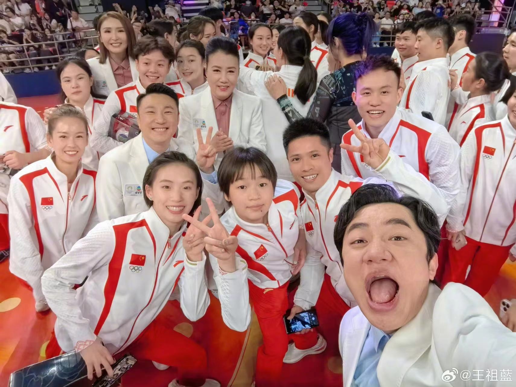 有不少網民分享祖藍與全紅嬋下場時的可愛互動,見全紅嬋一路小跑過後,來到祖藍身邊和他蹺手,祖藍也相當配合對方,兩人一起蹦跳離場!網民都大讚他們是一對「活寶」。祖藍連續出兩個帖文,先是分享合照,之後再上載影片,由於上一屆國家隊訪港,祖藍也有份擔任司儀,所以他與許多運動員關係都不錯,再加上祖藍在內地參與過不少綜藝節目,知名度非常高,大家都有和祖藍一齊影相留念~祖藍亦留言表示和新老朋友見面真的太開心,期待下一次見面:「合影大放送送送~今天因為直播時間關係,很遺憾有幾位運動員沒有採訪到,但還是很開心今天跟大家見面,香港歡迎你們」。而在祖藍粉的這條影片裡,可以見到祖藍正在和全紅嬋加微信,而一旁的另兩位跳水冠軍昌雅妮、陳藝文見狀也興奮加入,大家更提議建群組,非常有愛!不過最令網民笑爆的,是全紅嬋在與王祖藍分別時的搞怪表現!見全紅嬋「皺著眉頭」作抱歉狀,不斷地向祖藍揮手說:「不好意思,不好意思,我們先走了」。即使王祖藍已經表示沒事,但全紅嬋仍持續揮手,依依不捨的樣子,直到身旁的隊友將她拉走才願意離開,而這時祖藍的表情則彷彿是在說:「終於送走了!」兩人的「戲精」表現讓網民笑不停口,祖藍的「終於送走了」更一度登上微博熱搜榜前列,網民們都笑指超E人(MBTI職業性格測試中的一項,E人通常指外向、靠外界獲取能量的人)的祖藍根本抵擋不住更E人的全紅嬋!![]()