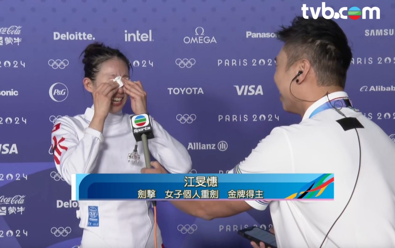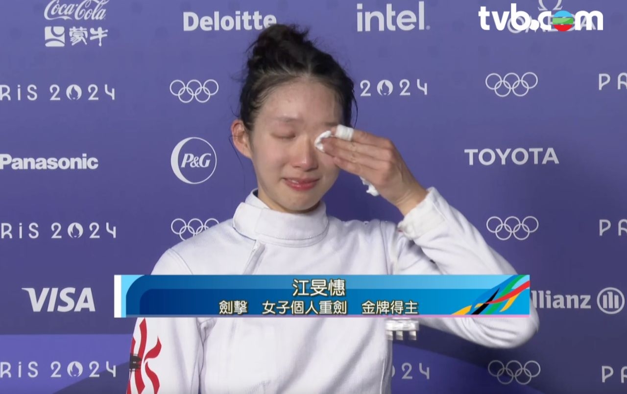 無綫身處巴黎的主持 何振然,於江旻憓(Vivian)寫下奪金歷史一頁不久,即成功捉到江旻憓做訪問,成為江旻憓奪金後第一個訪問。江旻憓更一邊受訪、一邊忍不住流下開心的眼淚,她邊流淚、邊傻氣地說:「我仲係唔相信,我唔知講咩,我每日起身都話畀自己知唔係今日比賽,到今日終於比賽喇,我好驚聽日起身又要比多次賽。」談到三年前八強止步忍不住淚灑,江旻憓又笑又喊謂:「我諗三年前我係話我唔要輸咗喊,因為我要贏咗先喊,所以我依家要喊晒出嚟。好多謝我團隊好多人支持我,我次次輸係輸我自己做得唔好,所以我好對唔住大家,今次我終於冇做得唔好喇。」