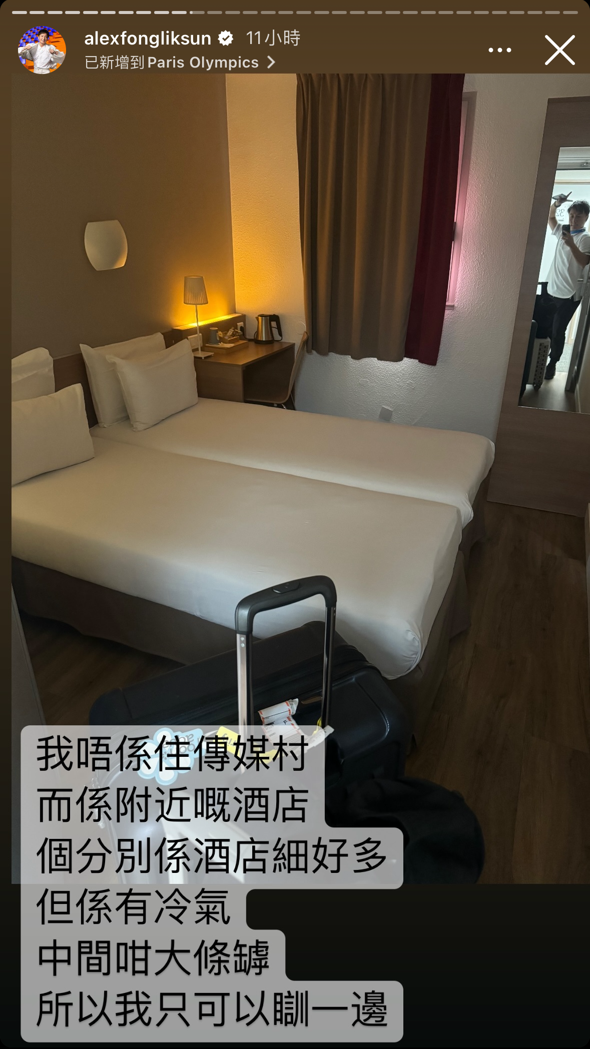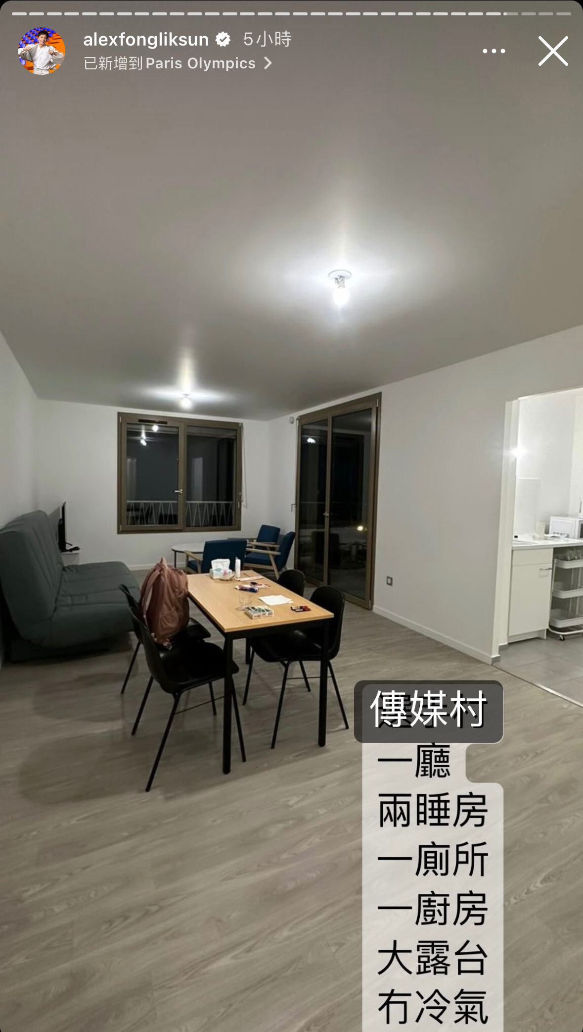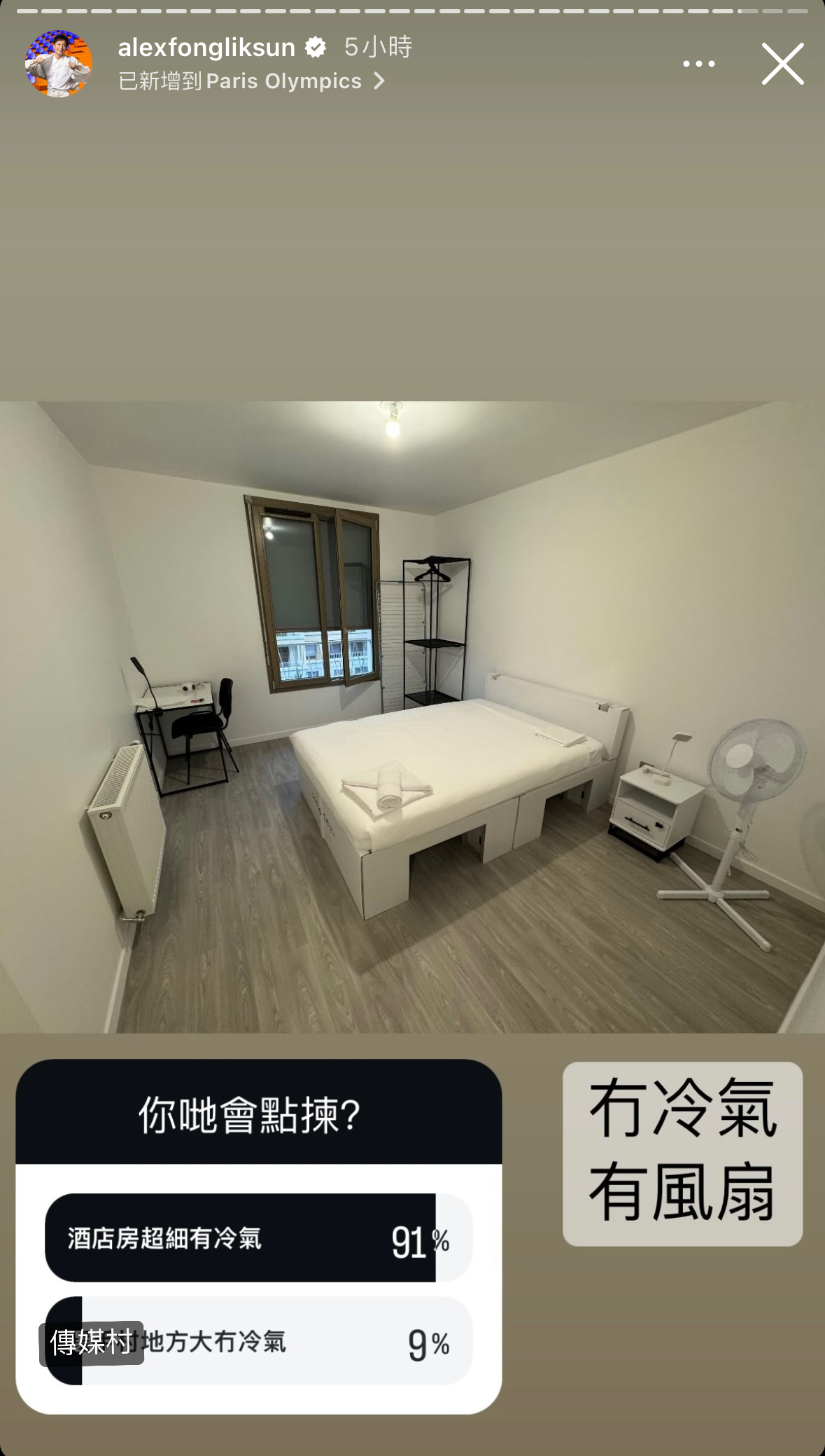 小方昨晚(25日)於個人社交平台分享巴黎奧運版Room Tour,他先上載兩張單人床的酒店房間照片,留言表示自己並非住在傳媒村,皆因傳媒村沒有冷氣;小方續指雖然所住酒店房間偏細,但勝在設備齊全。之後小方再分享傳媒村房間及客廳相片,並留言:「一廳、兩睡房、一廁所、一廚房、大露台、冇冷氣」,並發起投票與網民玩互動,選項分別是A「酒店房超細有冷氣」及B「傳媒村地方大冇冷氣有風扇」,網民幾近一面倒投A,足見冷氣的重要性。