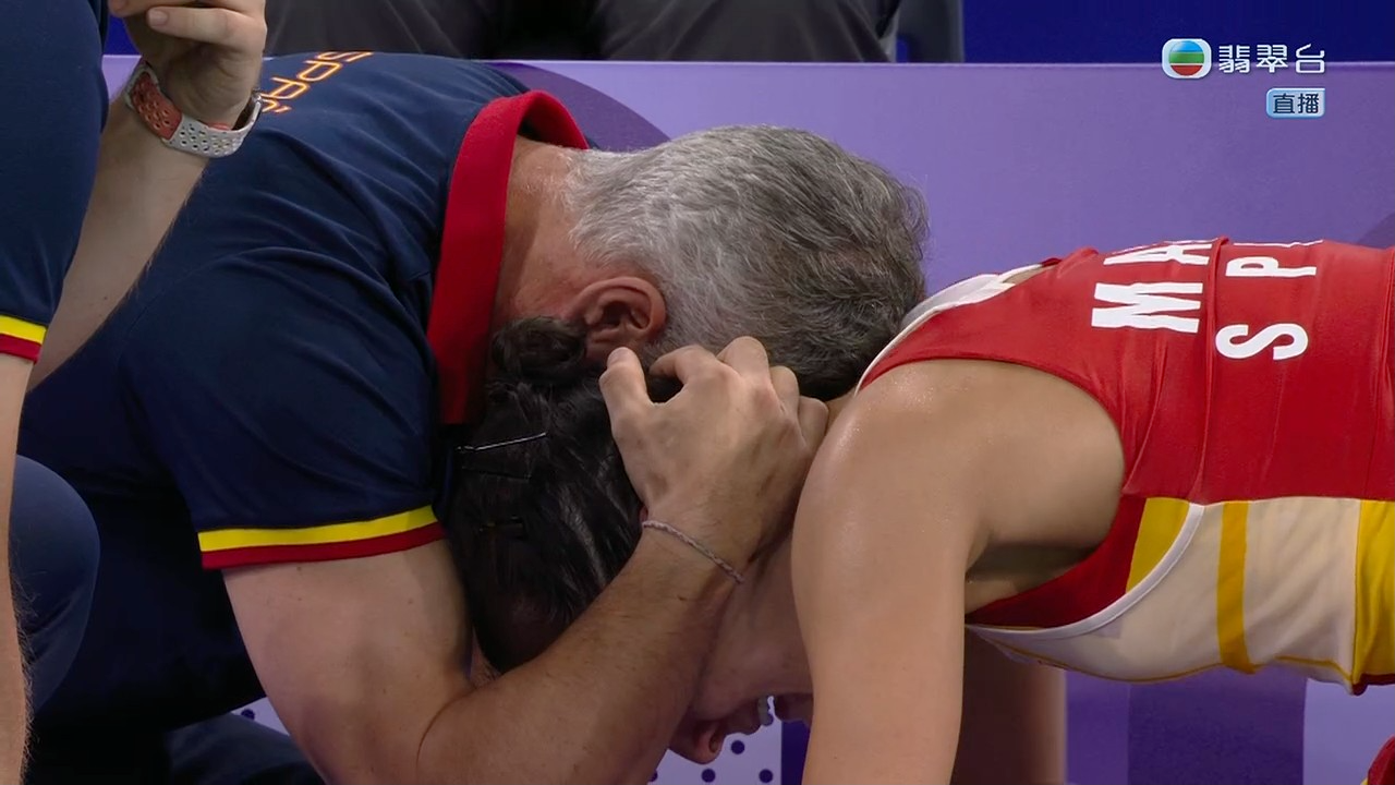 馬蓮仍堅持返回球場繼續比賽,全場觀眾立即起身送上熱烈掌聲及歡呼聲。只可惜重新登場的她明顯非常吃力,被何冰嬌連追兩分。結果她還是無奈退賽,面對突如其來的變故,四年的等待付諸東流,所有情緒上湧,她再也承受不住跪地痛哭,何冰嬌上前與她緊緊擁抱送上安慰,全場西班牙球迷也難過淚目。![]()