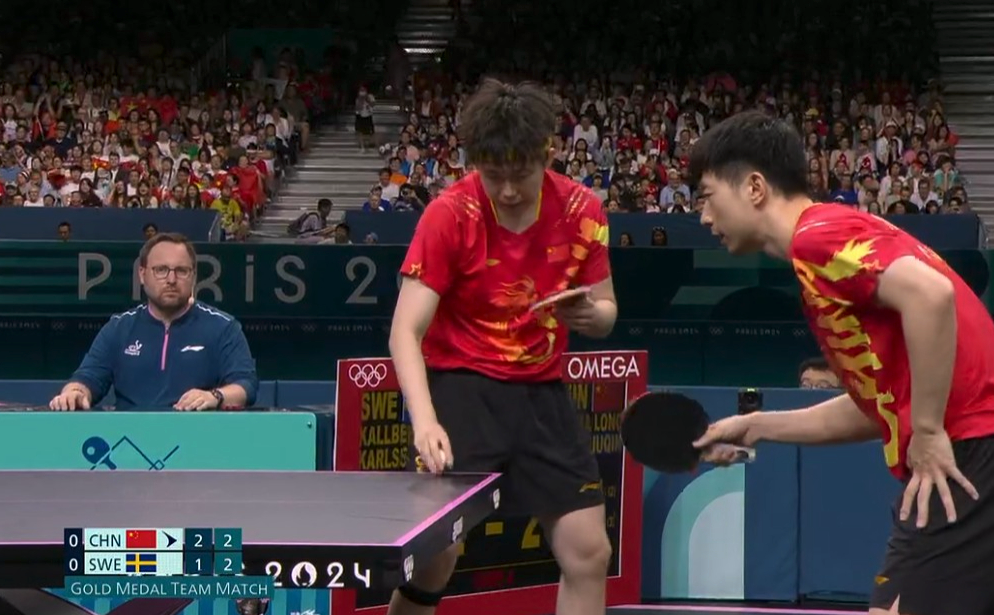 開場雙打賽先由國家隊馬龍、王楚欽出戰。開球馬龍同王楚欽就將比分迅速拉至7:2,不過就喺形勢大好的情況下,瑞典隊球手憑藉超強心態,強勢追擊,連贏7球,最後更以8:11贏得第一局;第二局開場,馬龍同王楚欽明顯狀態有所調整,連贏6球,最終以11:4速戰速決;第三局開場,馬龍同王楚欽依然勢頭強勁,連贏8球,而後以11:3大比分成功擊敗對手;第四局,瑞典球手完全沒有氣餒,反而愈戰愈勇!相反,馬龍同王楚欽在這局就始終處於稍稍落後的狀態,最終以6:11失局,瑞典球手再奪一局勝利;第五局決勝局,兩隊選手在開局比分差距細微,而在6:4比分之後,馬龍同王楚欽連贏3球,將比分拉至9:4,最後關頭乘勝追擊,以11:7取得該局、該場的勝利!