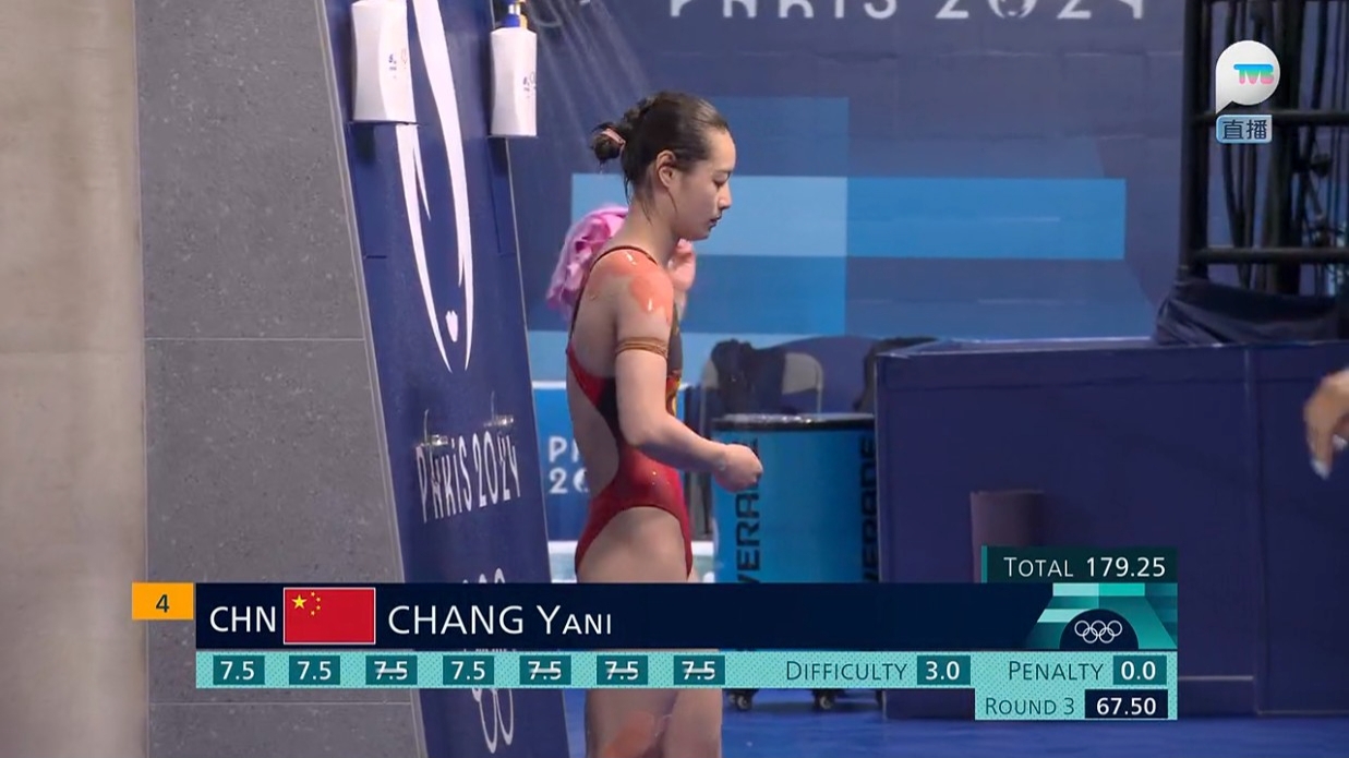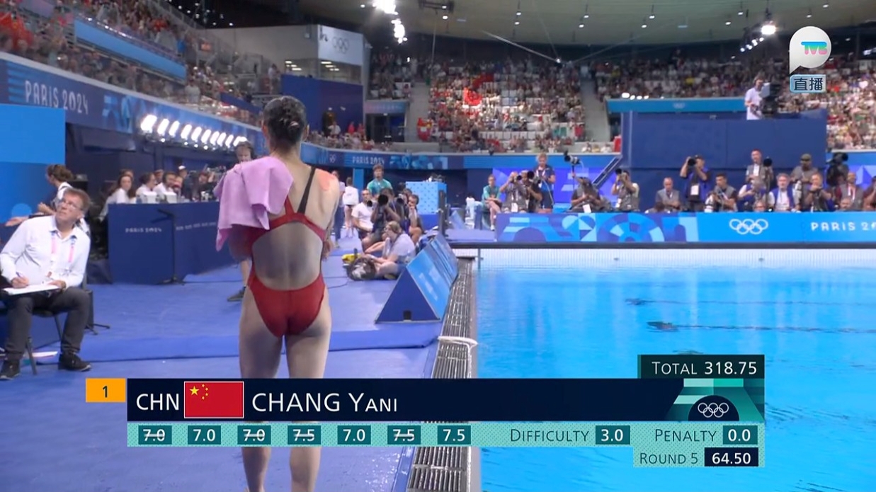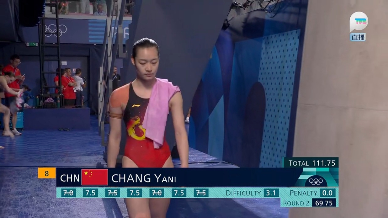 昌雅妮第一跳再次出現嚴重失誤,只得42.00分,排名倒數第一,不過喺之後四跳,昌雅妮頂住壓力,慢慢追返分數,第二跳69.75分,第三跳67.50分,第四跳75.00分,此時昌雅妮已經由最後一位追返至第三位!最後一跳,昌雅妮仍然相當緊張,發揮稍微失誤,得分64.50分,最終以318.75分,離第4名不夠10分的成績驚險摘銅!