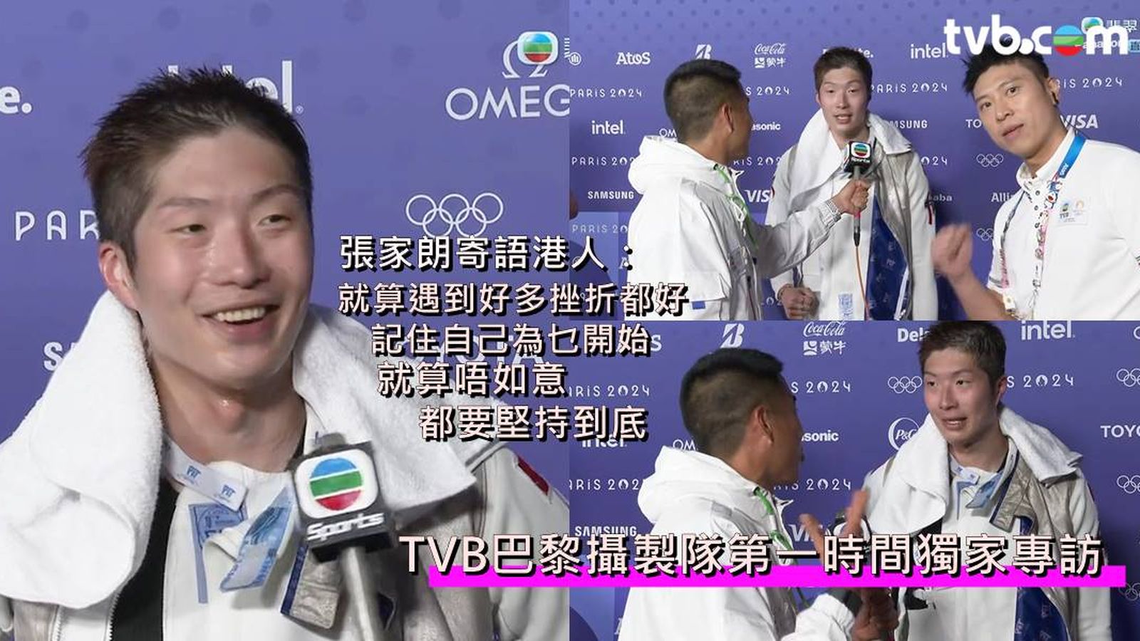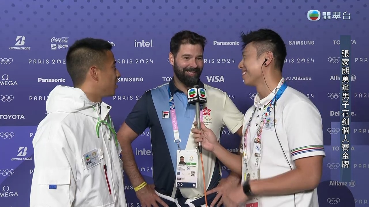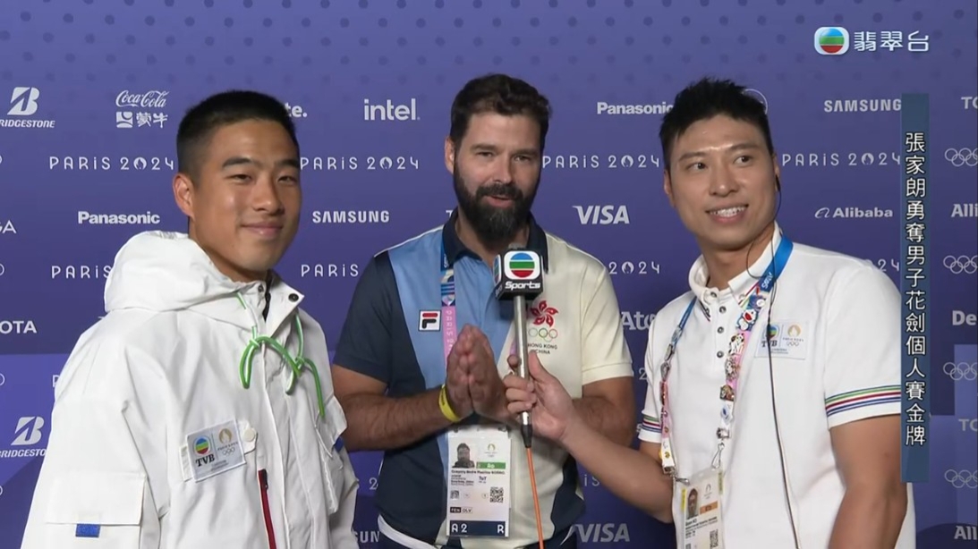張家朗在男子花劍決賽勝出奪金不久,無綫巴黎特派專員何振然及陳銘泰趁著還未舉行頒獎禮前,第一時間邀請家朗進行獨家專訪!何振然問到家朗連續兩屆創造歷史感受,尤其最後一分別具爭議性時,家朗說:「當時都覺得可惜,每次都覺得係自己,教練都係後面提醒我,唔好理嗰劍,係你又好,唔係你都好,Focus喺下一劍到,所以我就照教練所講咁做。」何再提及港隊現時有兩金一銅佳績,問家朗之前見到江旻憓VIVIAN奪金是否強心針時,家朗說:「好開心,佢一直都好努力,戥佢好開心,見到(港隊)劍擊成績一直有進步,對我嚟講都係強心針,我都要盡自己全部能力打到每一劍。」何振然訪問中又提及家朗全家現身巴黎支持家朗,問到家朗有甚麼說話對家人說,家朗笑言要將金牌送給到場支持他的爸爸:「送個生日禮物畀佢(爸爸),因為佢都係前幾日生日,起碼喺佢哋面前冇丟架。」並感激全港觀眾捱夜支持:「好多謝大家捱夜支持,聽日返工都仲睇我,好多謝大家,希望我冇辜負每一個人嘅期望。」