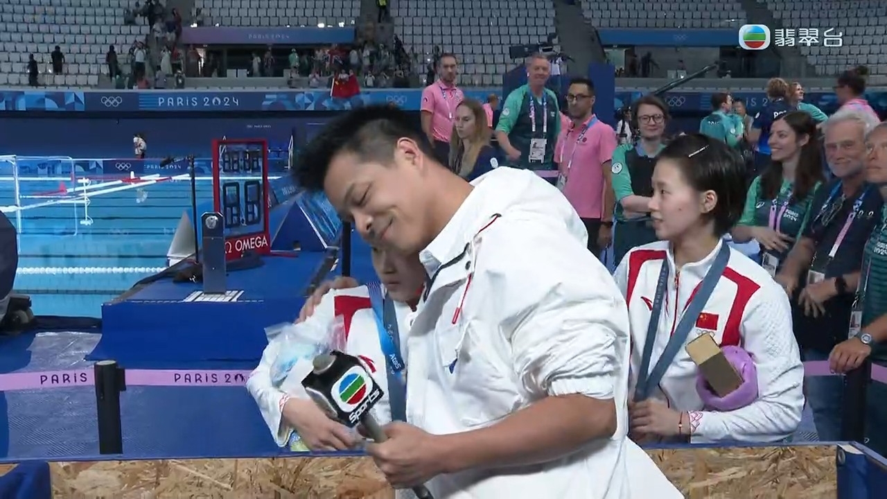 身為師兄的何沖,一見到拿著成手公仔兼紮紮跳的全紅嬋即疼錫地摸摸全紅嬋的頭,又給予師妹送上祝賀擁抱,場面溫馨。全紅嬋亦必恭必敬地回了一句:「師兄,你好。」全程忙著照顧成手公仔、一度不知如何是好的全紅嬋,談到比賽表現時說:「我覺得我還可以吧,沒有那麼緊張吧我覺得。」
