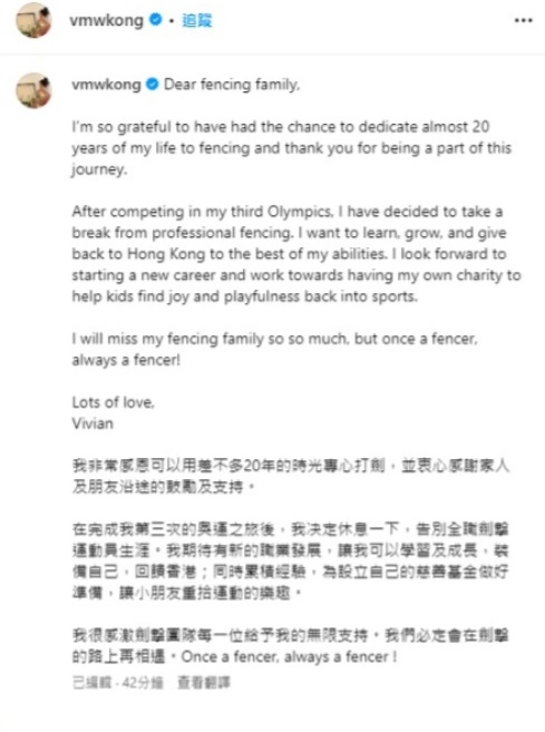 「微笑劍后」江旻憓在巴黎奧運奪得女子重劍個人賽金牌成為香港之光,今日她在社交網拋下震撼彈宣布退役,她留言:「我非常感恩可以用差不多20年的時光專心打劍,並衷心感謝家人及朋友沿途的鼓勵及支持。在完成我第三次的奥運之旅後,我决定休息一下,告別全職劍擊運動員生涯。我期待有新的職業發展,讓我可以學習及成長,裝備自己,回饋香港;同時累積經驗,為設立自己的慈善基金做好準備,讓小朋友重拾運動的樂趣。我很感激劍擊團隊每一位給予我的無限支持。我們必定會在劍擊的路上再相遇。Once a fencer, always a fencer !」