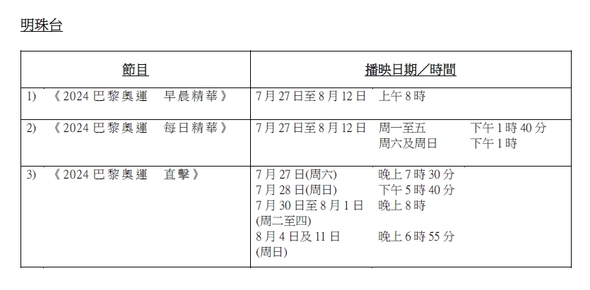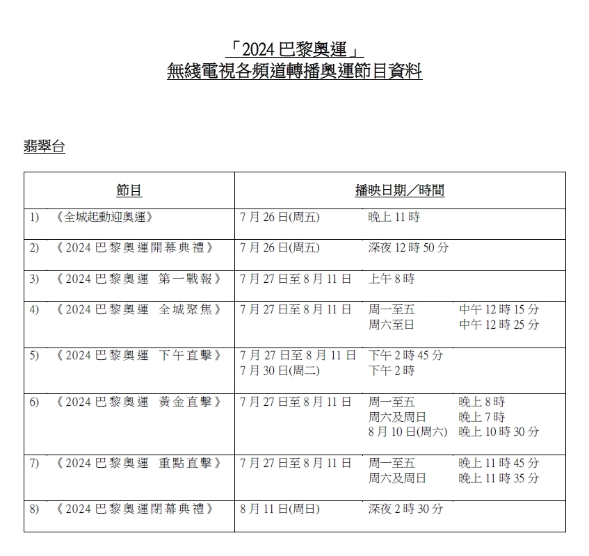 「2024巴黎奧運」將於7月26日(本周五)香港時間深夜於法國巴黎盛大揭幕,無綫翡翠台為隆重其事,於26日當晚11點開始已如箭在弦,先播出巴黎奧運開幕禮熱身節目《全城起動迎奧運》,之後再於當晚深夜12時50分開始直播開幕盛典。為隆重其事,當晚主持及藝人陣容相當鼎盛(排名不分先後),除有林溥來Patrick Sir、朱凱婷、陳懿德、陸浩明、潘靜文、林正峰、6位奧運之星、鍾志光,專業評述朱詠康(劍擊)、蕭靜雯(羽毛球),另外還有周吉佩、羅啟豪、支嚳儀、顔志恒、陳菁葶、陳俞霏、林思彤(前名:林若盈)、顏米羔、何晉樂、文凱婷、黃洛妍、李茵彤,以及2024年度香港小姐15強佳麗等。賽事方面,無綫20+組頻道,包括翡翠台(81台)、TVB Plus(82台)、無綫新聞台(83台)、明珠台(84台),myTV SUPER 17組頻道,及官方社交平台(3組)屆時亦會為觀眾進行鋪天蓋地直播、賽前分析、賽後精華及重點賽事採訪,務求第一手直擊全城期待的國家隊及港隊運動員奪金珍貴一刻。