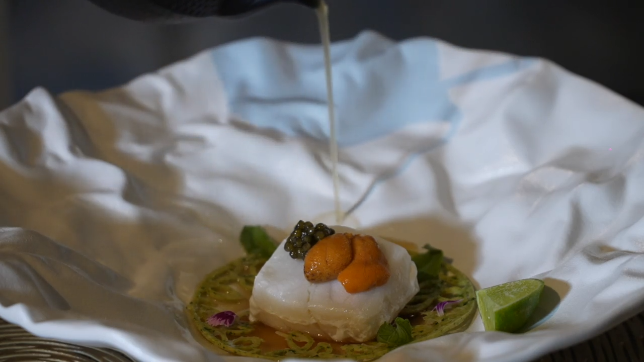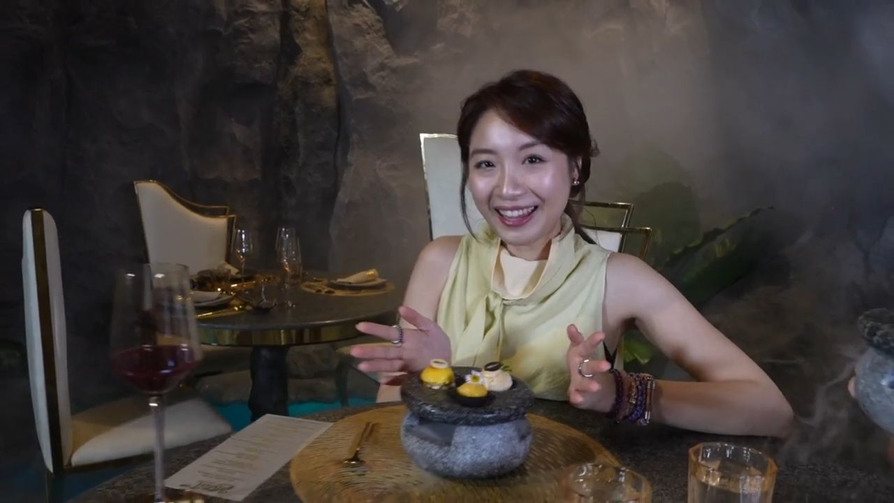 餐廳雖小五臟俱全,環境更猶如仙境。服務人員戴著神秘面罩,帶領你進入霧氣環繞、瀑布小河的餐廳內部。餐廳提供套餐形式,分別是8道料理5,990銖(約1,400港幣)以及10道料理7,990銖(約1,800港幣),兩位主持人則選擇10道料理套餐。包括、銀鱈魚配海膽、冬陰功馬卡龍等,每道料理猶如藝術品般賞心悅目。![]()