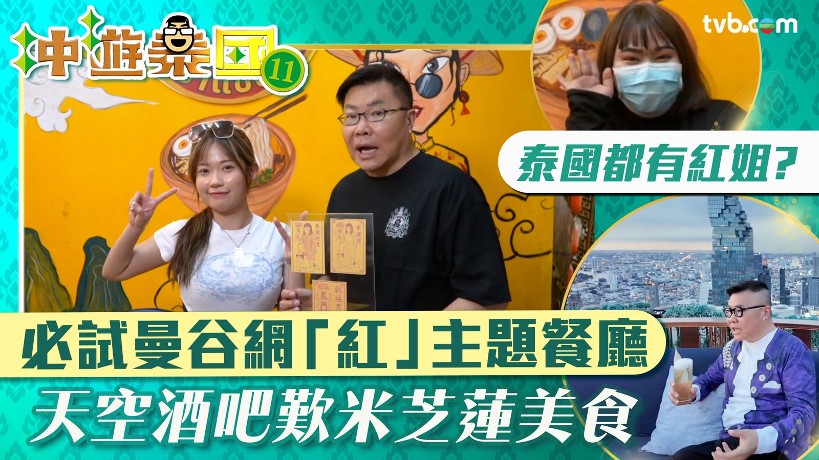 冲遊泰國11第十二集|節目去到最後一集,今集有「泰國通」胡慧冲(Roger)帶領「冬蔭家族」及「人氣女神」波波黃婧靈遊泰國曼谷盞鬼「紅姐」主題餐廳;兼拜訪由停車場改建而成的特色傢俬店與Cafe;但仍不少得打卡時裝店內的豪華cafe,與擁有270度靚景天空餐廳酒吧啦!
