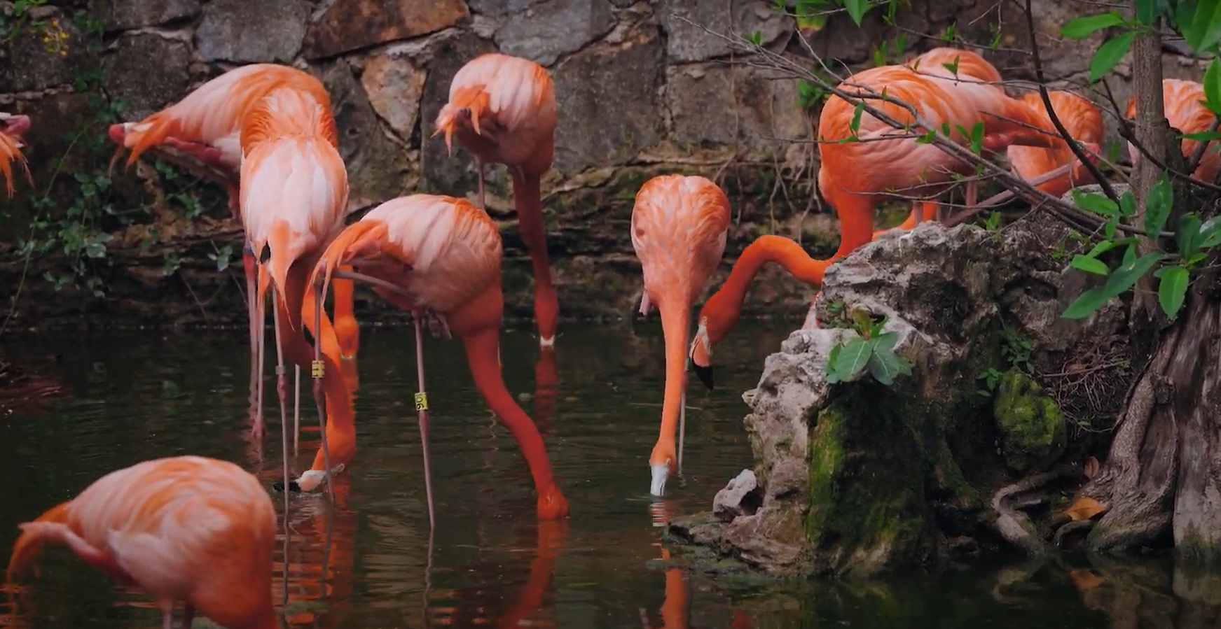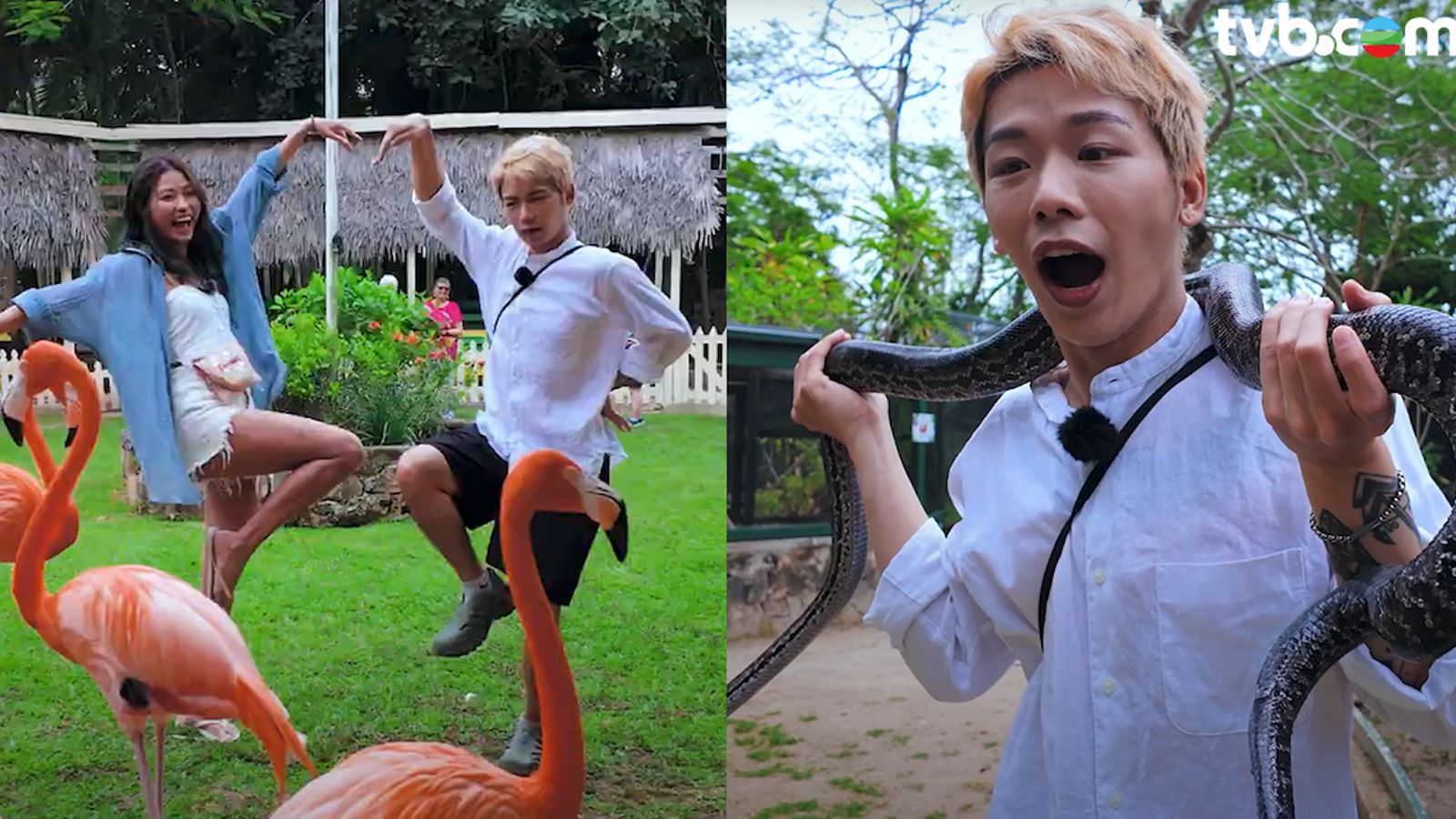 至於今日的主角“火烈鳥”終於隆重登場了,成群結隊的火烈鳥,毛發光澤鮮艷。主持人興奮觀摩它們的神態還有步姿,Kanya說曾經在非洲看過大片的火烈鳥,但是只能遠觀,從未像今天一般如此近距離觀賞過,因此內心特別激動!