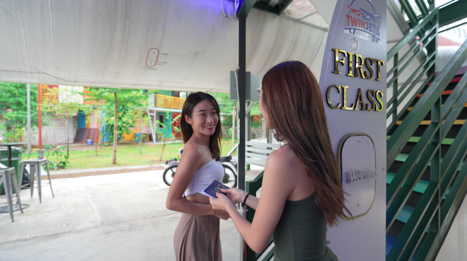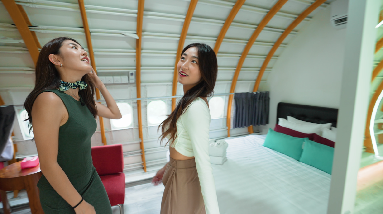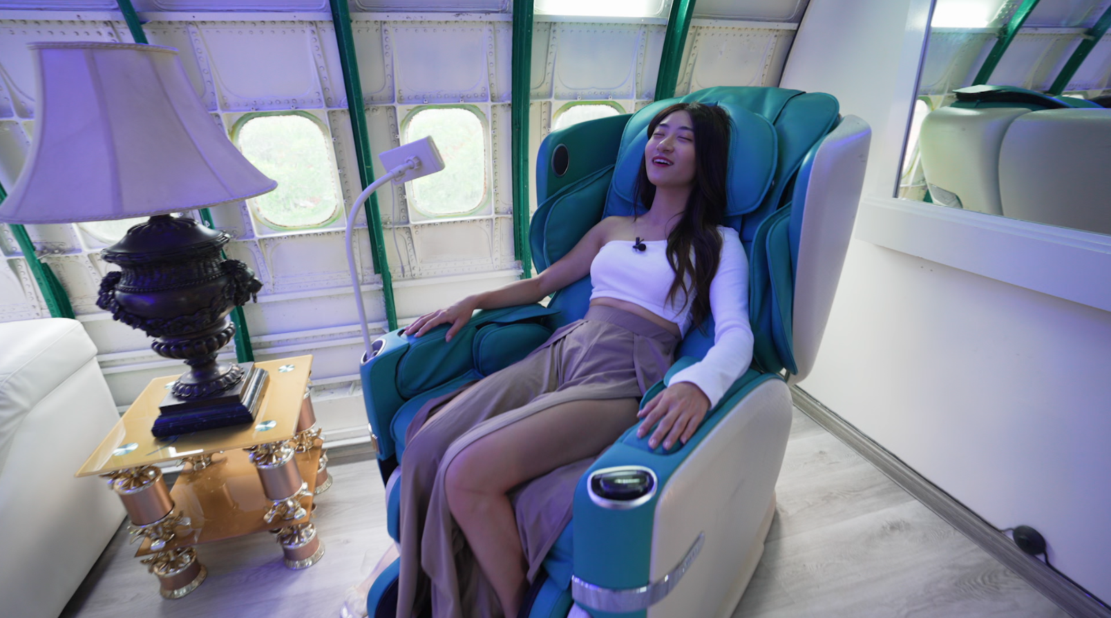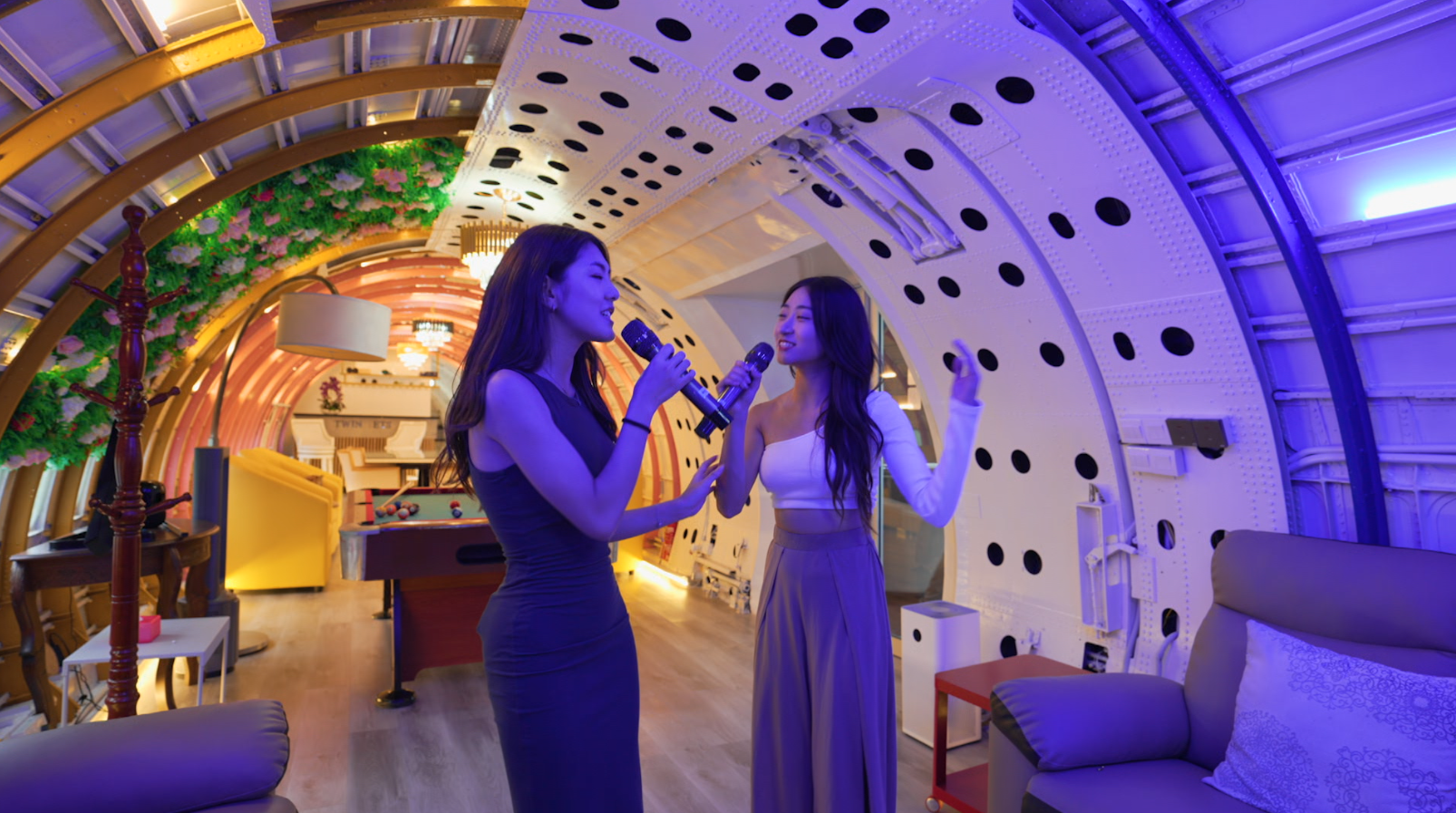 酒店將整架飛機全部打通,裝修豪華,就連KTV、按摩椅都有,Jacy也玩性大發,cosplay空姐為JoJo提供服務!酒店房間空間非常大,也相當適合一家三口親子住宿。