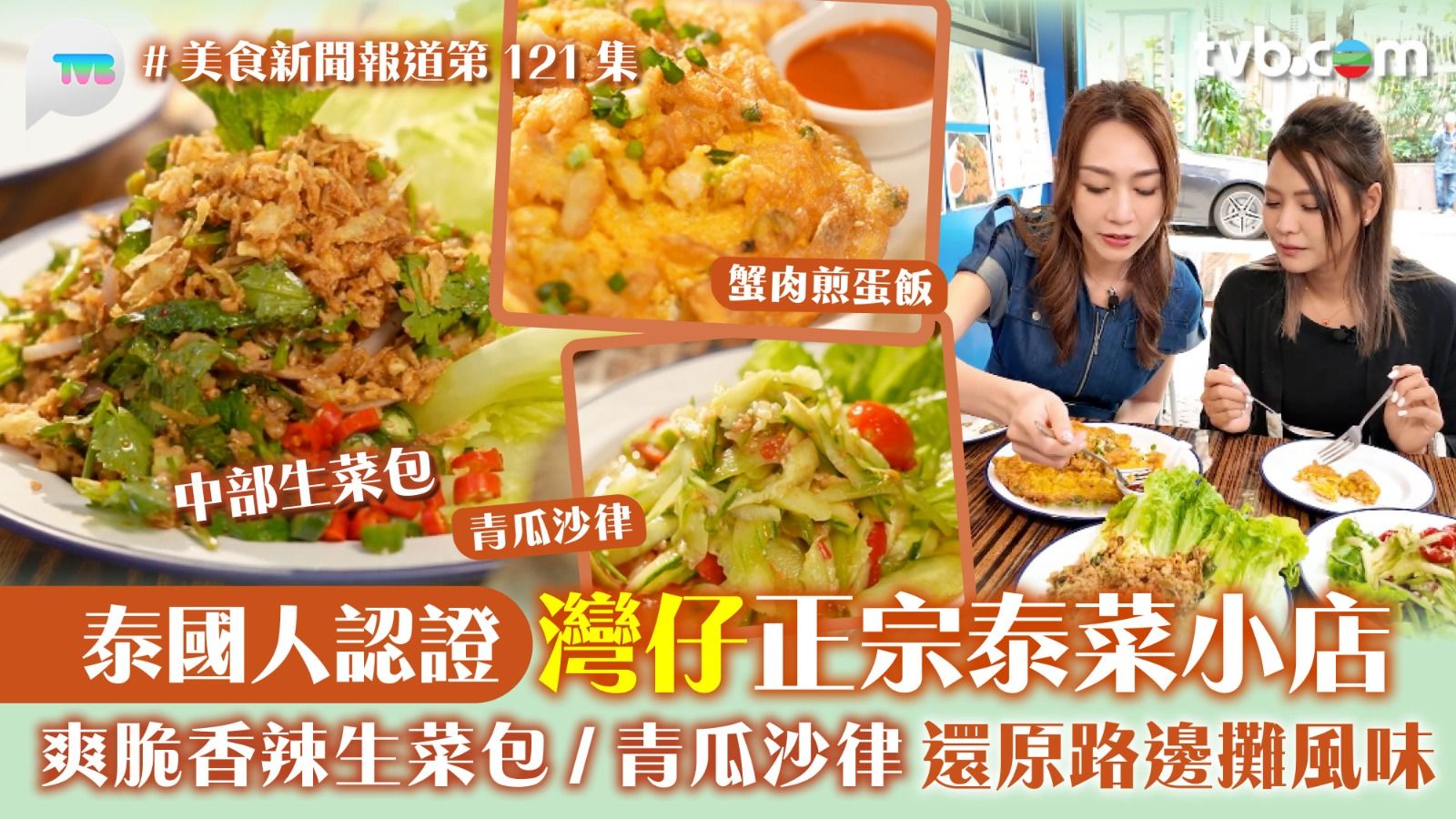 今集《美食新聞報道》由居港泰國人Aimee帶黃嘉雯(Carmaney)到灣仔搜羅正宗泰國菜餐廳!這間店經常大排長龍人氣火爆,最佳到店時間為下午1400後。Aimee首推店內隱藏菜單,特色泰式青瓜沙律,酸辣開胃,夏天消暑開胃必食!泰國女生大多對飲食控制較為嚴格,青瓜沙律或木瓜沙律廣受歡迎。第二道中部生菜包,表面鋪滿炸蒜、洋蔥等配料,豬肉的油脂香氣與不同香料互相呼應,惹味十足!