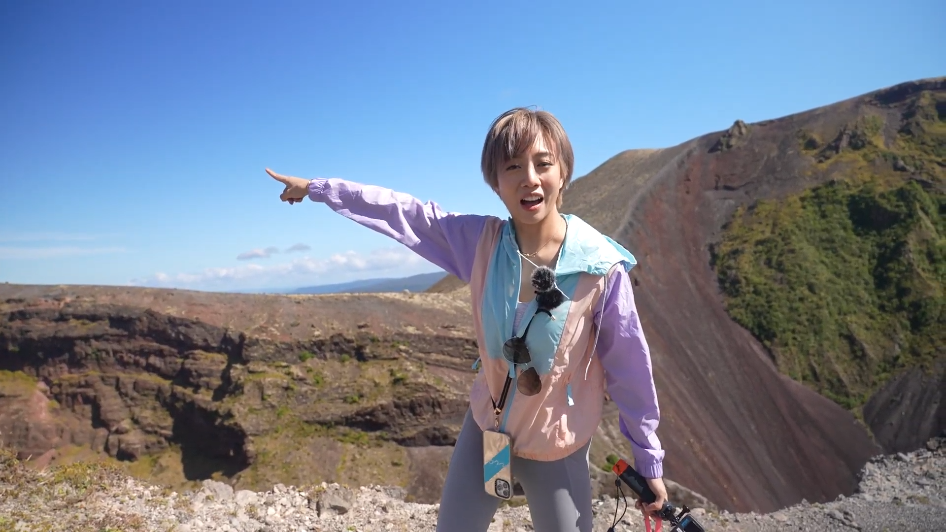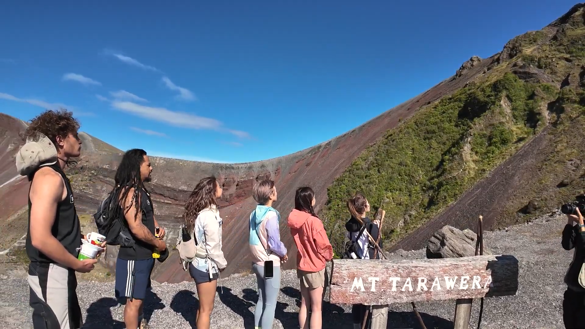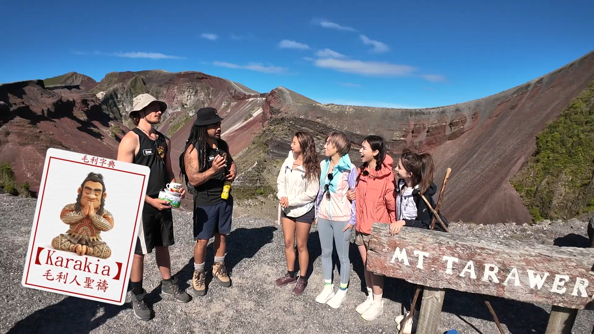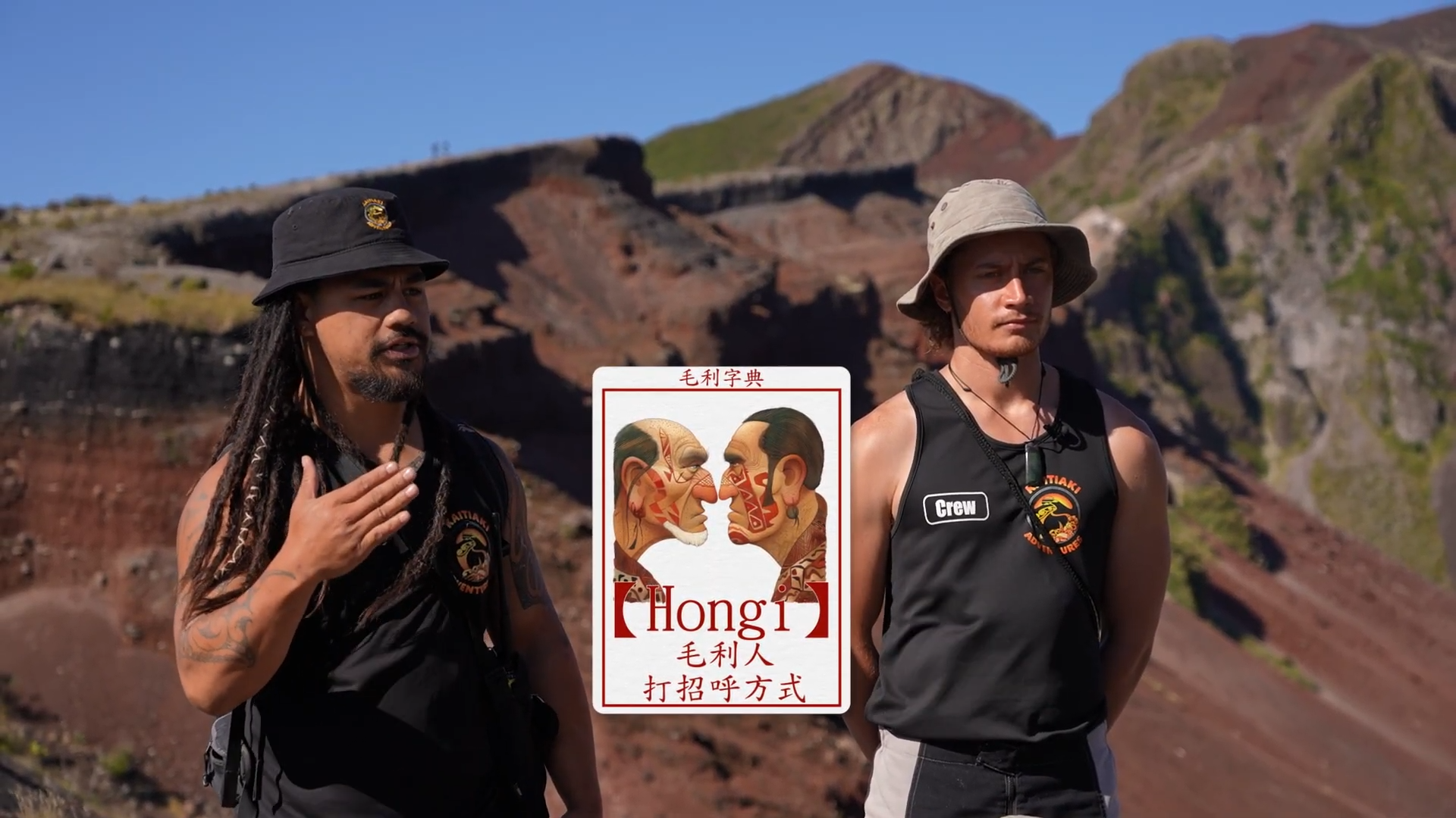 主持們解釋:「以前啲部落都會喺呢到,加上個山本身有好強勁嘅能量。」、「喺火山爆發前,好多酋長過咗身會將佢哋埋葬喺到,所以對佢哋嚟講係好神聖。」另一位登山嚮導 Hare教她們簡單毛利人打招呼方式,Jessica指學打招呼很有趣,「因為香港人都係握下手,HELLO,而佢哋係會鼻貼鼻兩次,咁我覺得,無論邊年紀咩身份,都係咁打招呼,係幾特別。」![]()