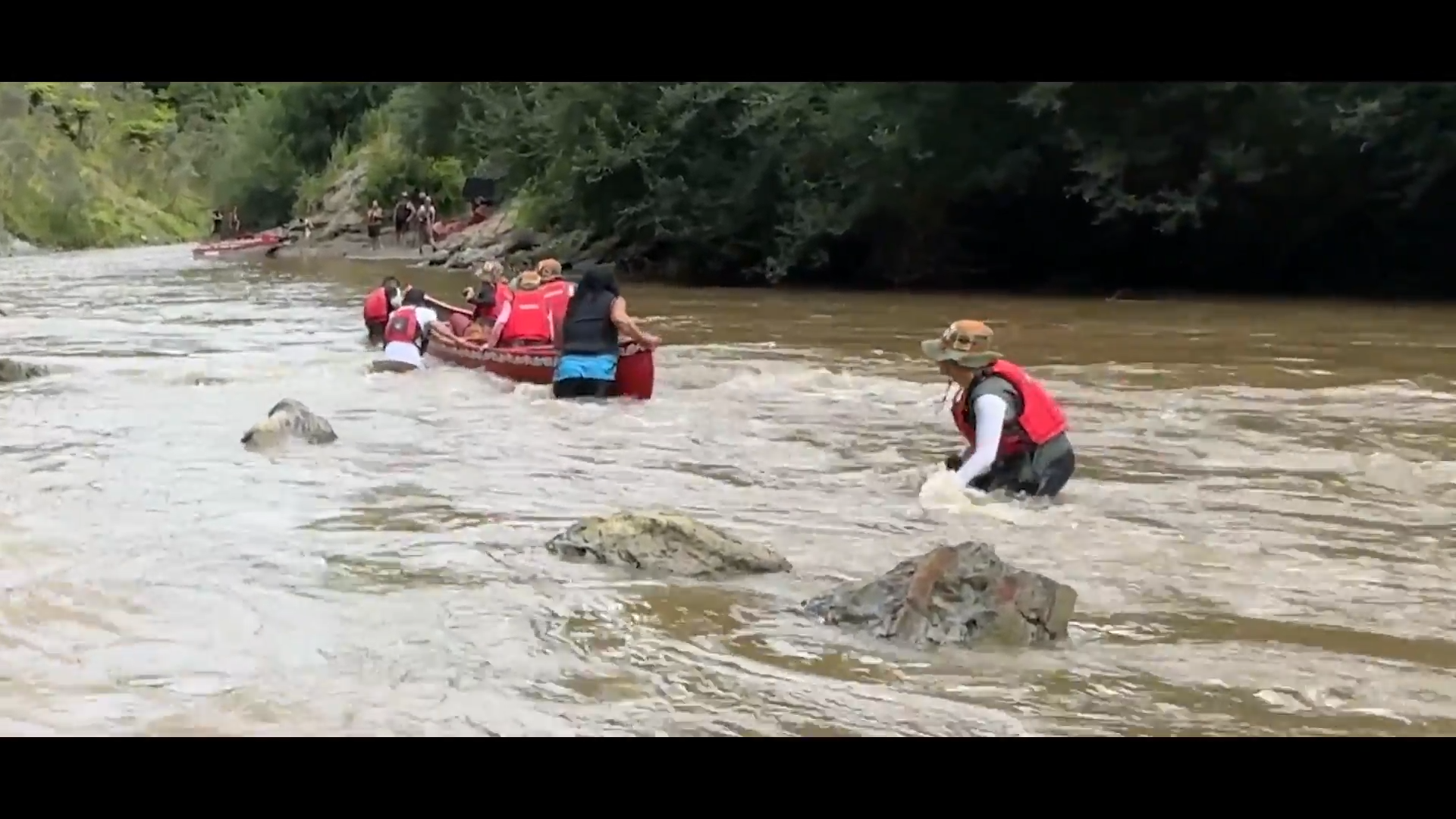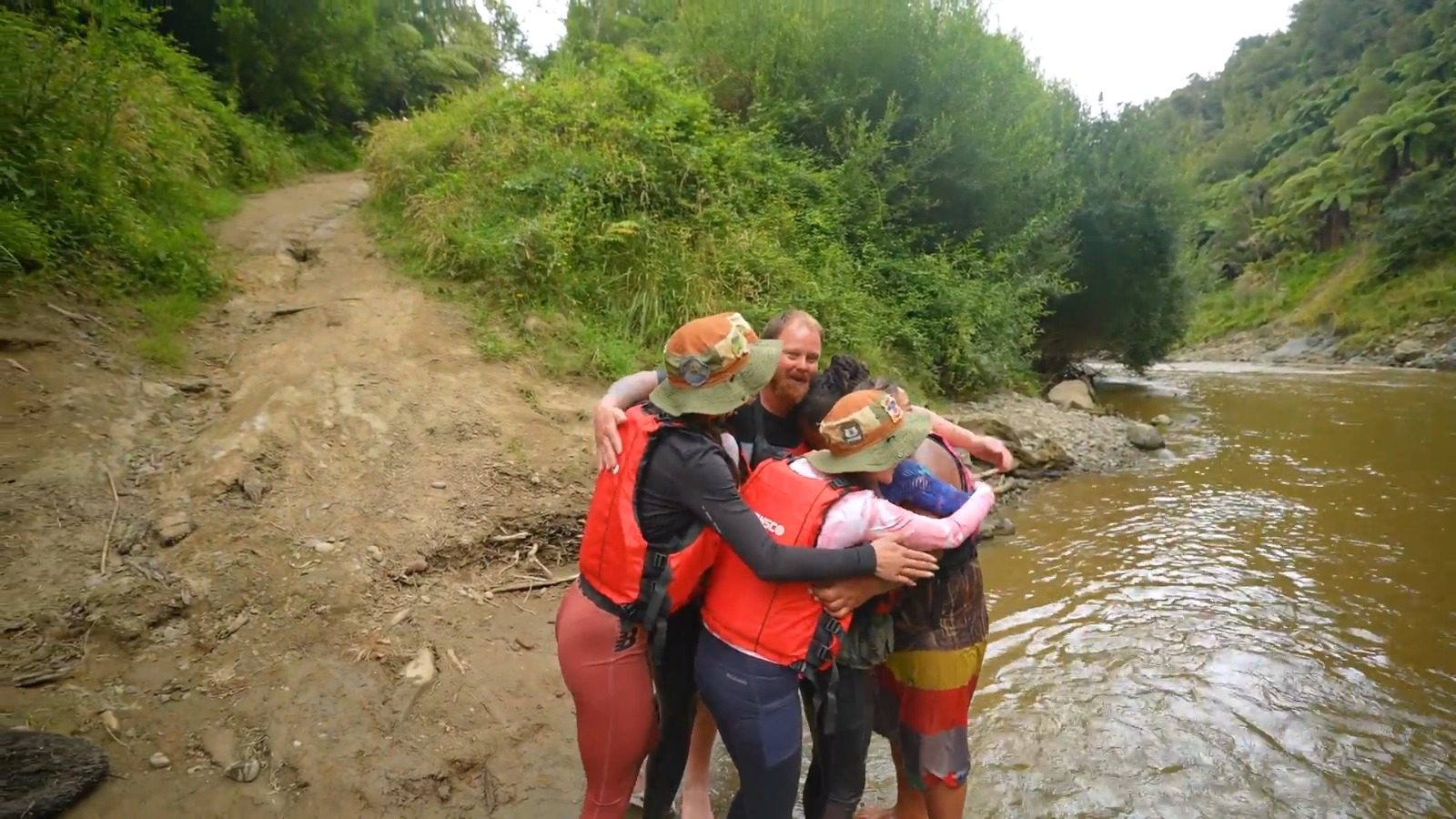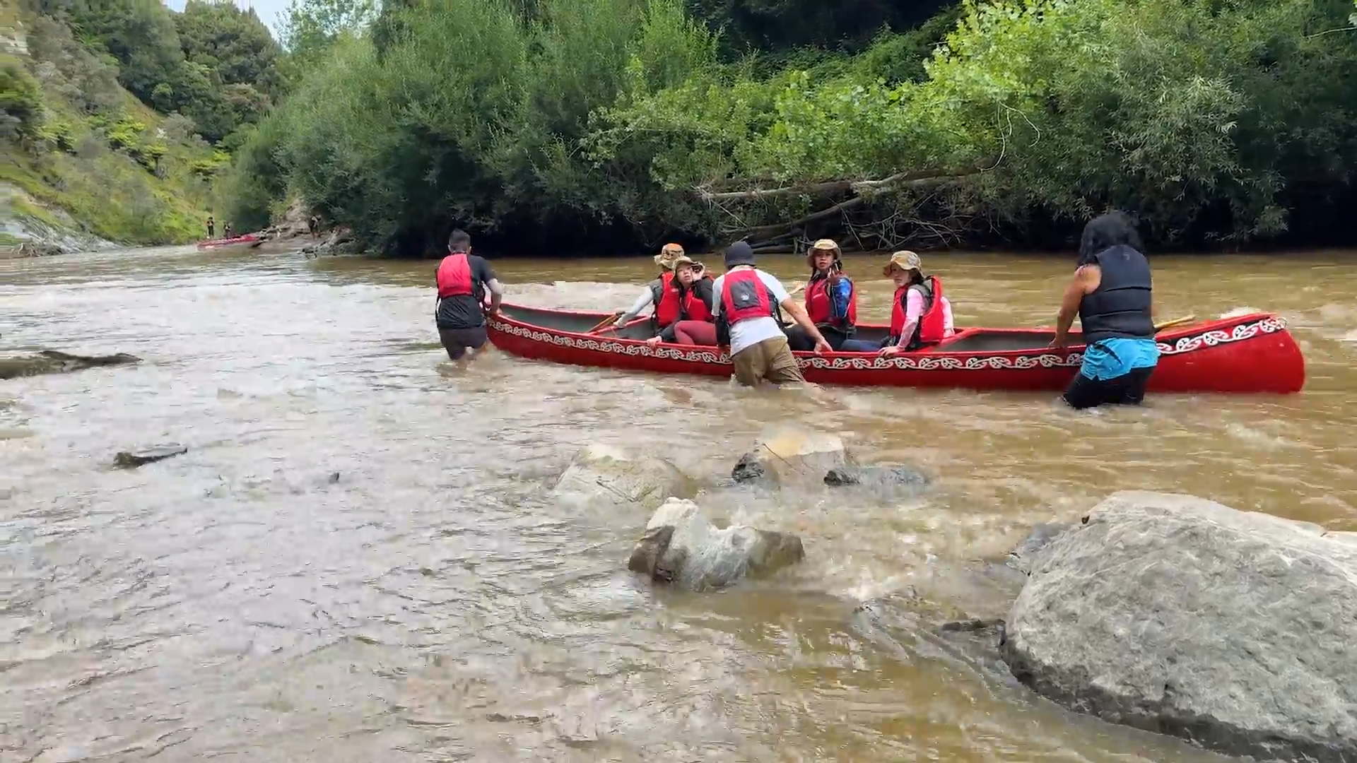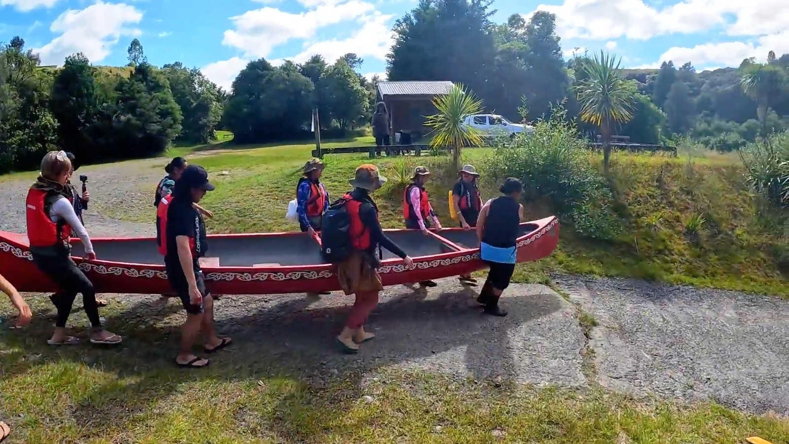 由於之前落大雨,為了安全考量,所以大家決定由原定的57km,變成划35km,即由campsite划到Whatahoro,預計所需時間為6小時。今次用的艇非常重,要集10人之力才能搬動,但過程都相當辛苦。最後在河川守護者Willi主持落河儀式後,眾人正式出發!Jessica邊划邊說,其實艇有浪推着,可以不太用力划也會前進。![]()