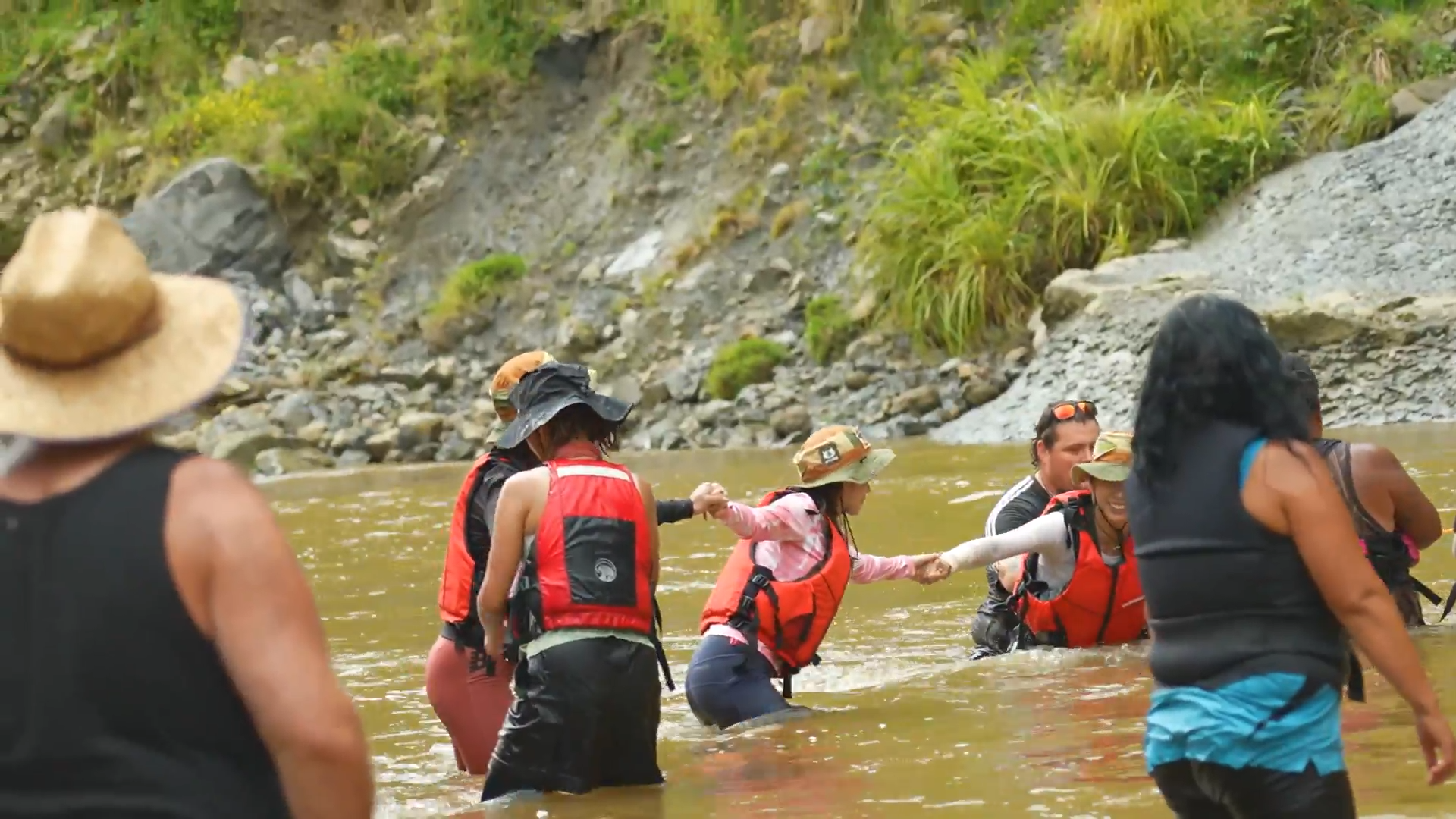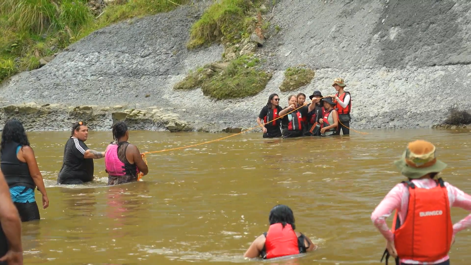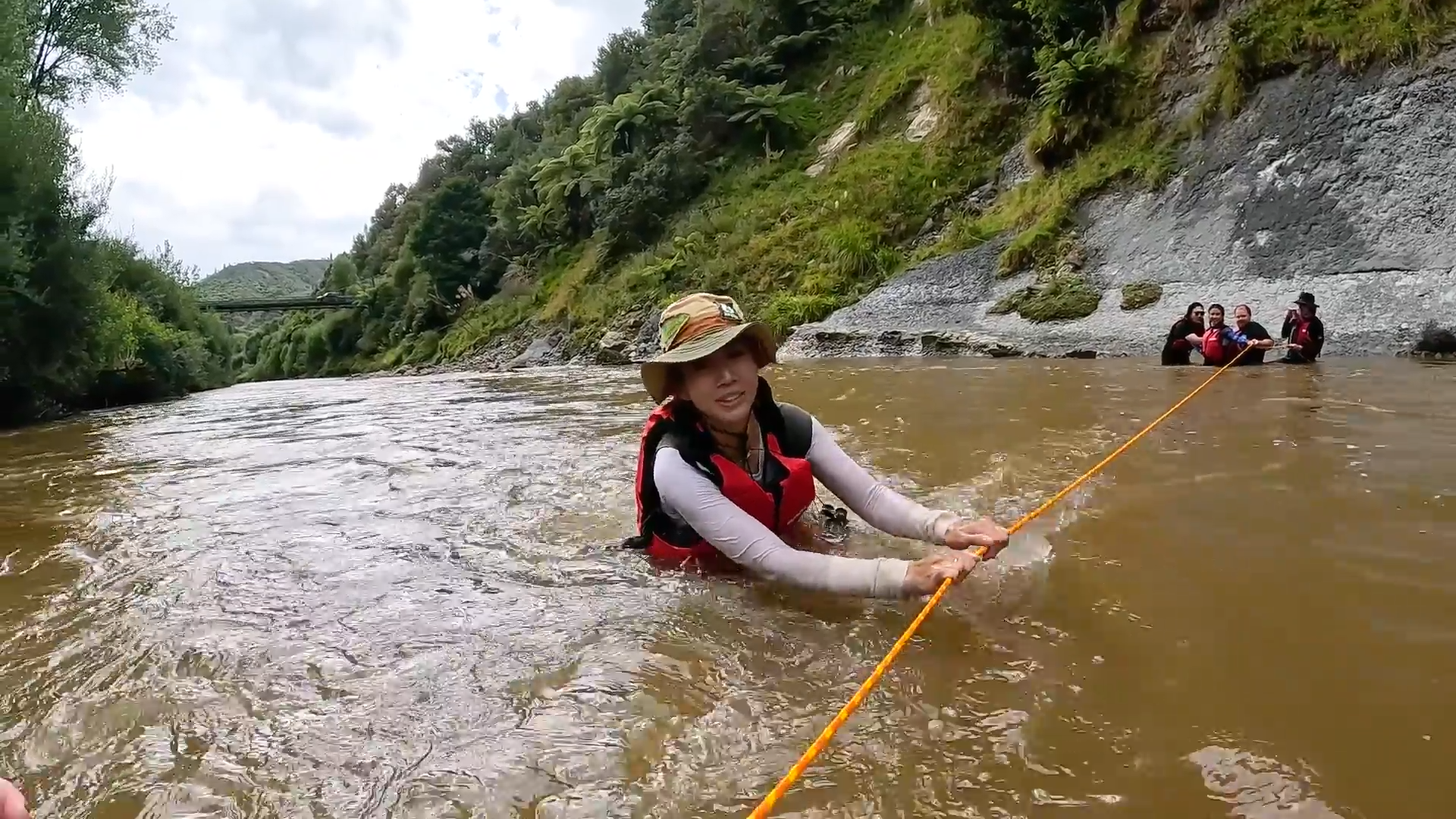 最後,由於水流太急,Nicole一行人未能過到對面岸與其他會合。最後要兩邊合力用繩,逐個人拉着繩,抵着水流慢慢行到對面岸,幸好,最後大家都成功平安上岸。![]()