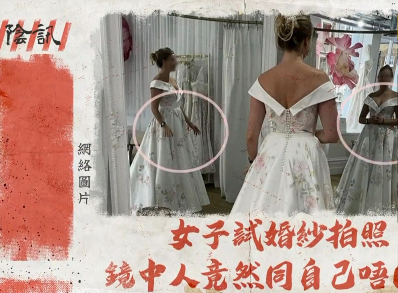 《直播靈接觸》第十五集,分享了一則「陰訊」,是指外國有女子在試婚紗時,站在兩塊鏡中間影相,事後竟從相中驚覺本人與兩塊鏡中自己的雙手姿勢不一樣。她表示自己本身是一隻手垂低,一手彎起,但在相中其中一塊鏡是兩手垂低,而另一塊鏡則是兩隻手彎起。她起初,以為鏡有問題,但後來證實只是普通的鏡,她接着到手機公司檢查手機,店員告訴她有時手機影相是會捕捉到用戶身體移動,所以這張相是二合為一,但出現這個機會率只有一百萬份之一!