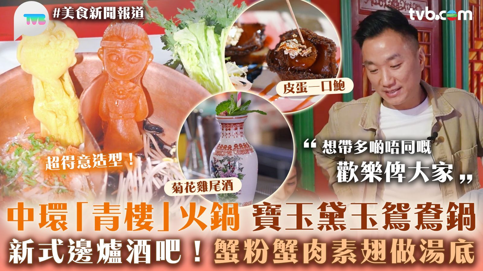 今集《美食新聞報道》「故事味緣」主角是「青樓」火鍋店老闆Kason,因熱愛《紅樓夢》,開設以賈寶玉住處「怡紅院」為藍本的中式火鍋店,希望讓食客們「沉浸式」體驗中國傳統文化!餐廳將酒吧與火鍋二者融合,餐廳處處可見Kason的巧思。如招牌鴛鴦湯底的「蟹肉濃雞湯」及「廣式麻辣湯底」,被製成特製的「寶玉」與「黛玉」冰磚公仔,極具創意!湯底更是真材實料,使用蟹肉、蟹粉、花膠、三黃雞等材料熬製,並且即叫即做。