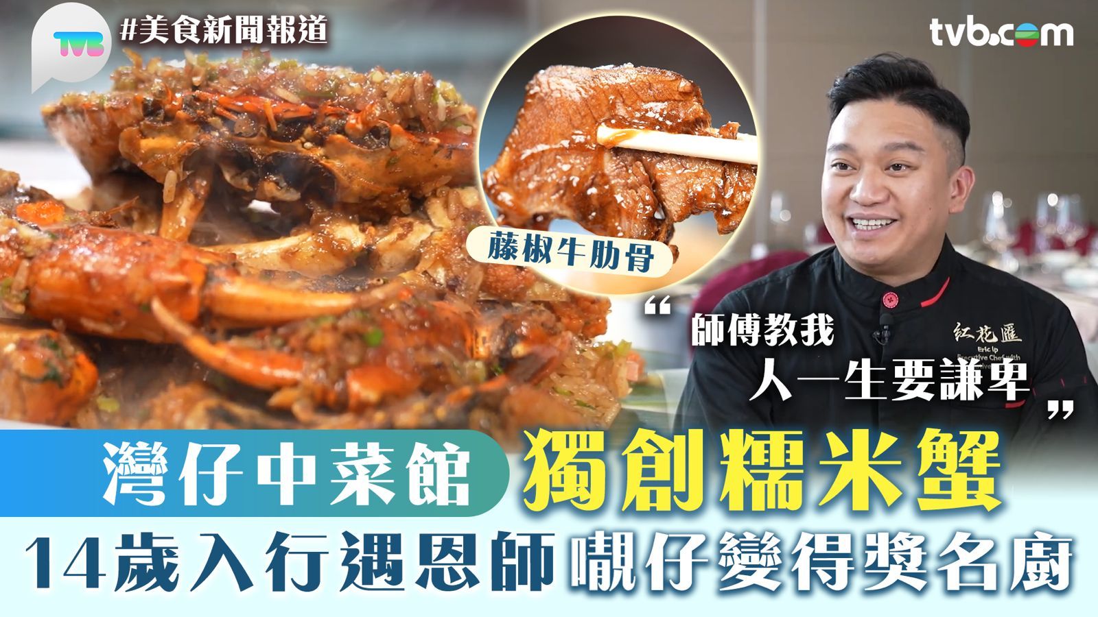 今集《美食新聞報道》「故事味緣」的主角,行政總廚及餐廳負責人-葉世昌從14歲開始跟師父德哥學廚,遇到一生的伯樂偉哥後,開始明白學廚如學做人,變得成熟穩重,更加尊重自己的職業。許多常光顧的客人都誇讚他的廚藝與創意,26年來斬獲無數大獎。「招牌糯米蟹」精選膏蟹油炸後加入炒製的糯米飯,糯米與膏蟹相得益彰,拿捏精準!「花雕香醋海馬友」這道菜在昌師傅手下斬獲獎牌,酸度與甜度拿捏得恰到好處!「藤椒牛肋骨」麻辣口味的牛肋骨市面上不算常見,在昌師傅手下煎後又收汁,辛香適口!