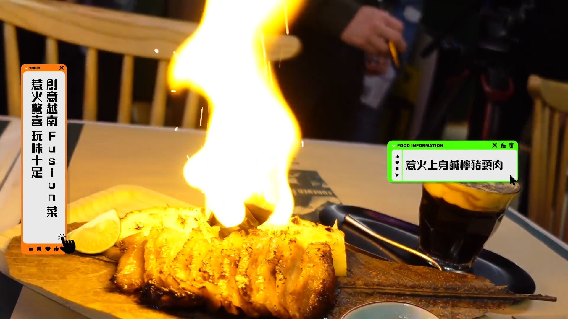 「惹火上身鹹檸檬豬頸肉」,是名符其實的惹火上身,在上菜時會點火,視覺效果已先贏了一仗!豬頸肉以鹹檸檬醃製,烹調後表面會有焦糖味,甜甜的,肉質鮮嫩多汁,配上青檸汁,可減低油膩感。
