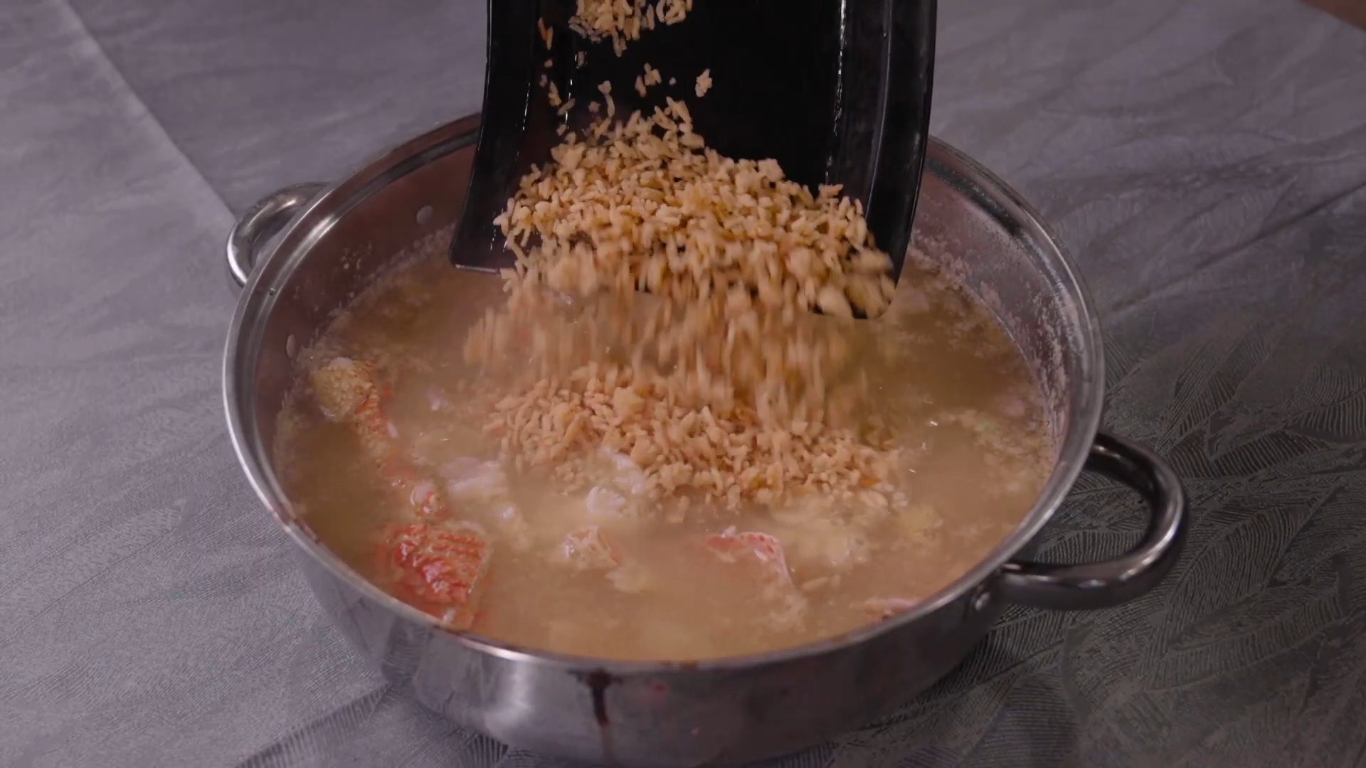 先炸蝦頭,搗碎煲成濃郁的蝦湯,再加入雞湯滾起。再把龍蝦頭抓拉油,放入龍蝦湯一起滾,再落飯。炸米會用白飯,雞蛋黃拌上,炸起讓其脆口不易燶。