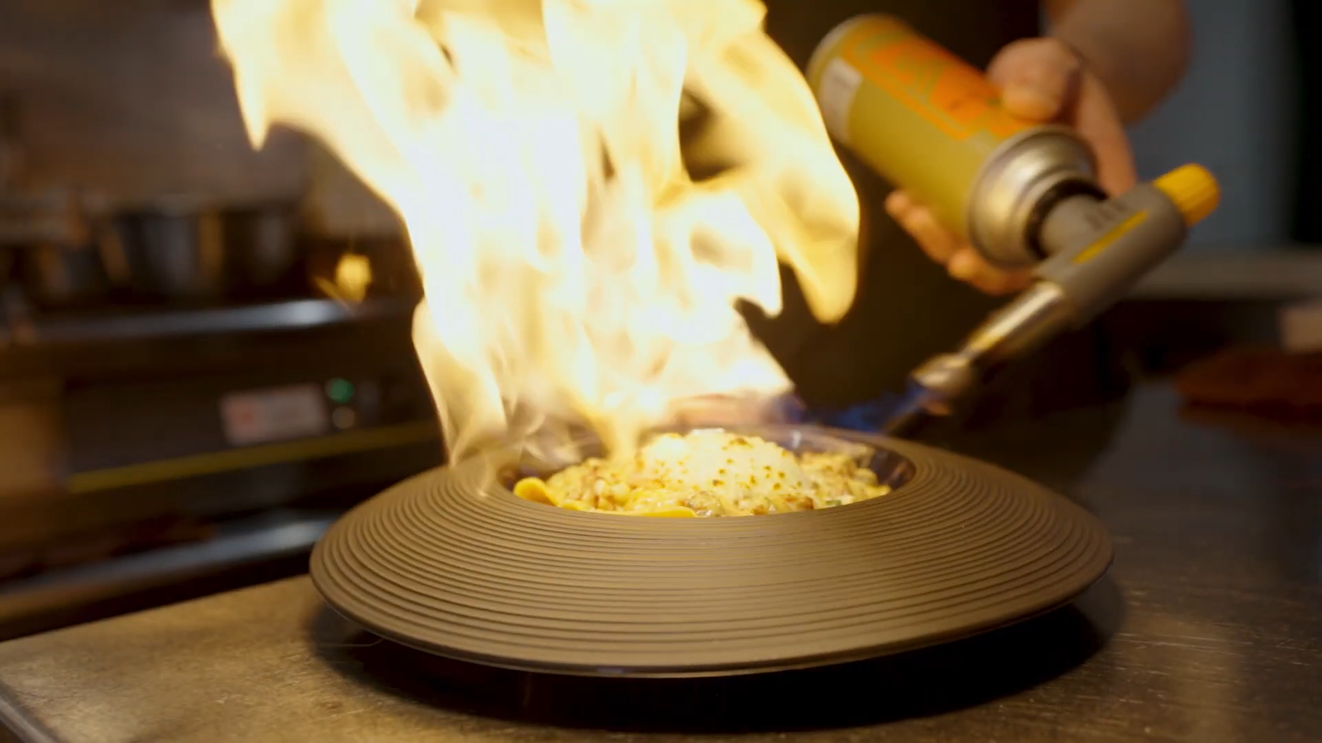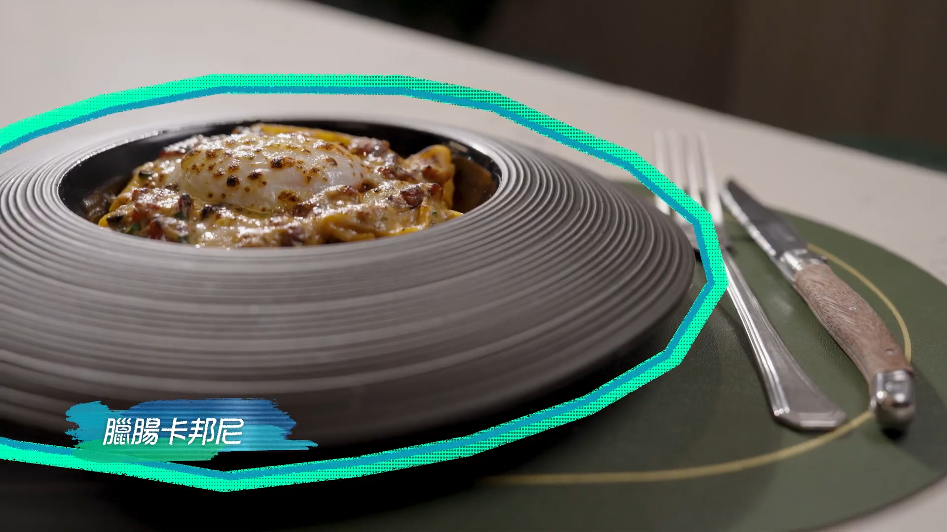 臘腸卡邦尼,以臘腸代替意式煙肉和風乾豬面頰肉,先爆香臘腸,迫出油香,加入蒜蓉、黑椒、雞湯白酒,以及意粉。最後加上温泉蛋,再燒一燒,令表面帶焦香味道。