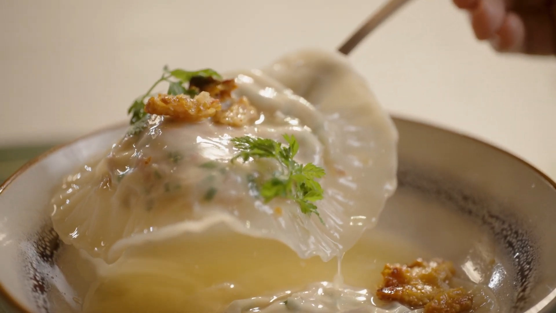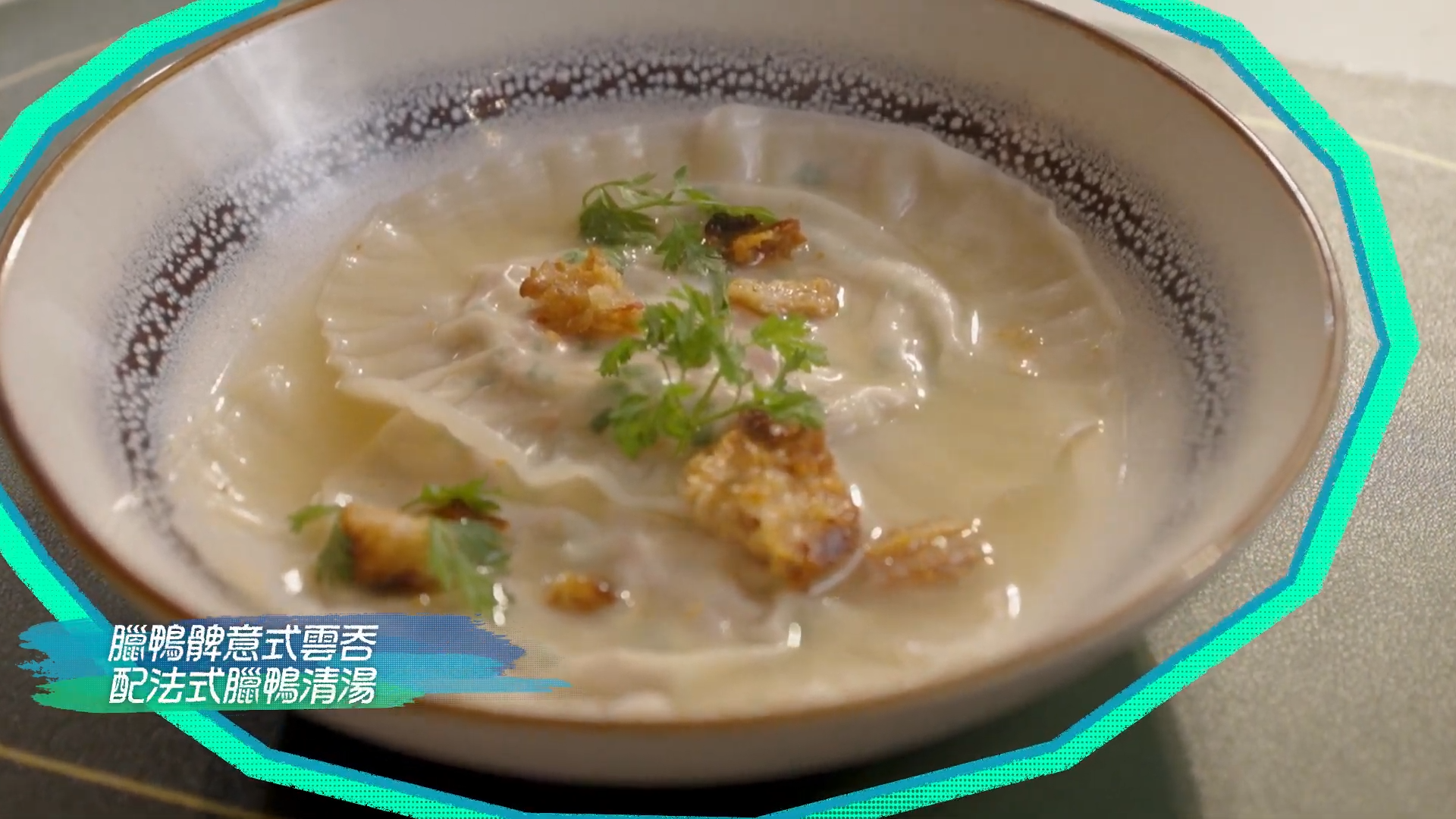 臘鴨髀意式雲吞配法式臘鴨清湯,採用用醃製風乾的本地臘鴨脾肉、加上芝士和䓤和韭黃做成雲吞餡,之後把炒好的臘鴨骨和煎香的米鴨煲成煲底。再加入蛋白不停攪拌,蛋白就會吸走肉的雜質,臘鴨清湯就製成了。Luke分享創作這道菜時,經歷過無數次失敗,「我只想做到最好嘅,先拎出嚟畀客人。」![]()
