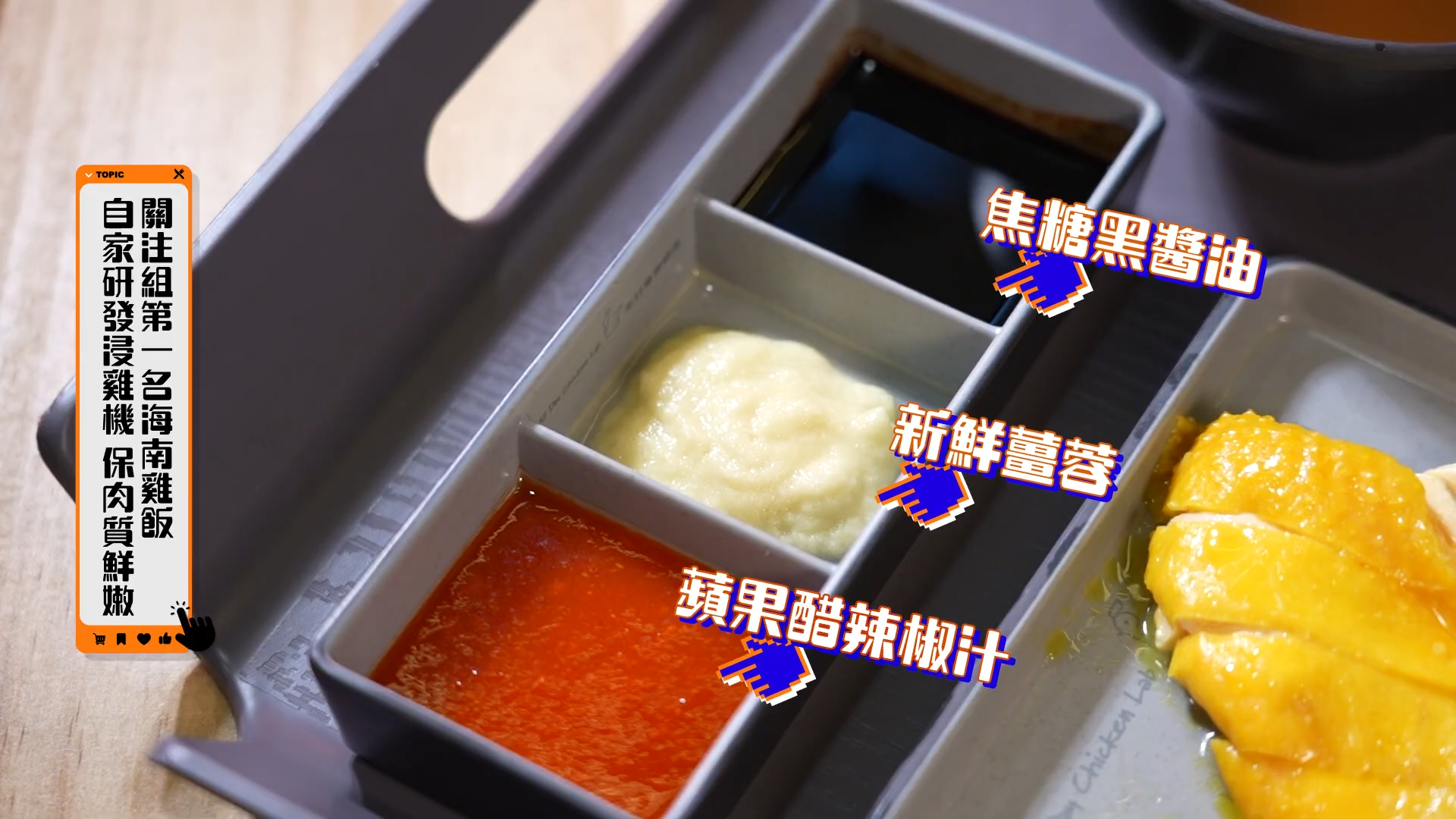 食客可自選雞翼、雞胸或雞脾,每件雞都是肉眼看得到的嫩滑。原來秘訣就在店舖自家研發的浸雞機,可按雞不同部位所需時間去浸,確保肉質鮮嫩。配合蘋果醋辣椒汁、新鮮薑蓉及焦糖黑醬油3種醬料,每啖都有濃濃的雞味,一點也不肥膩。![]()