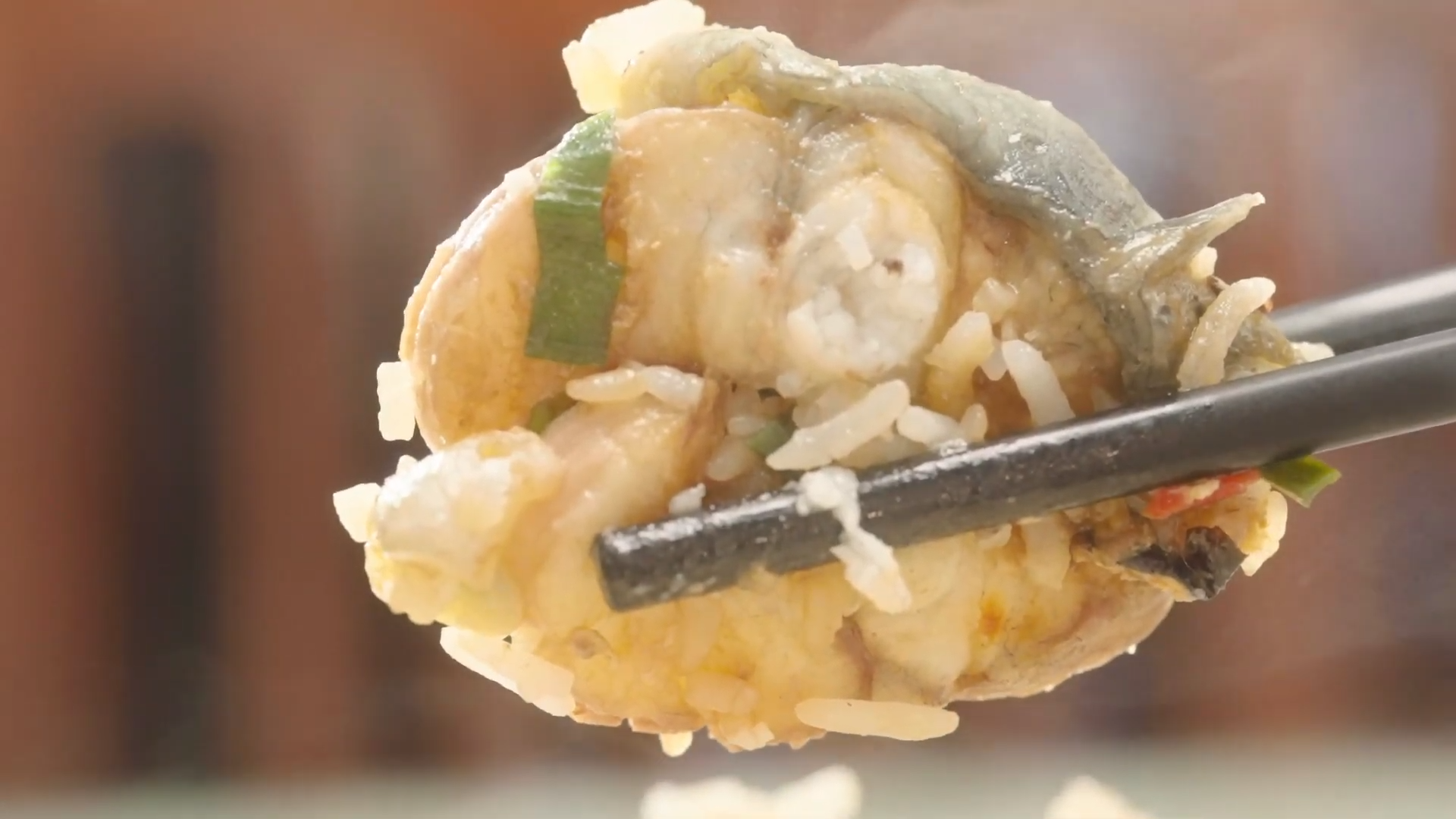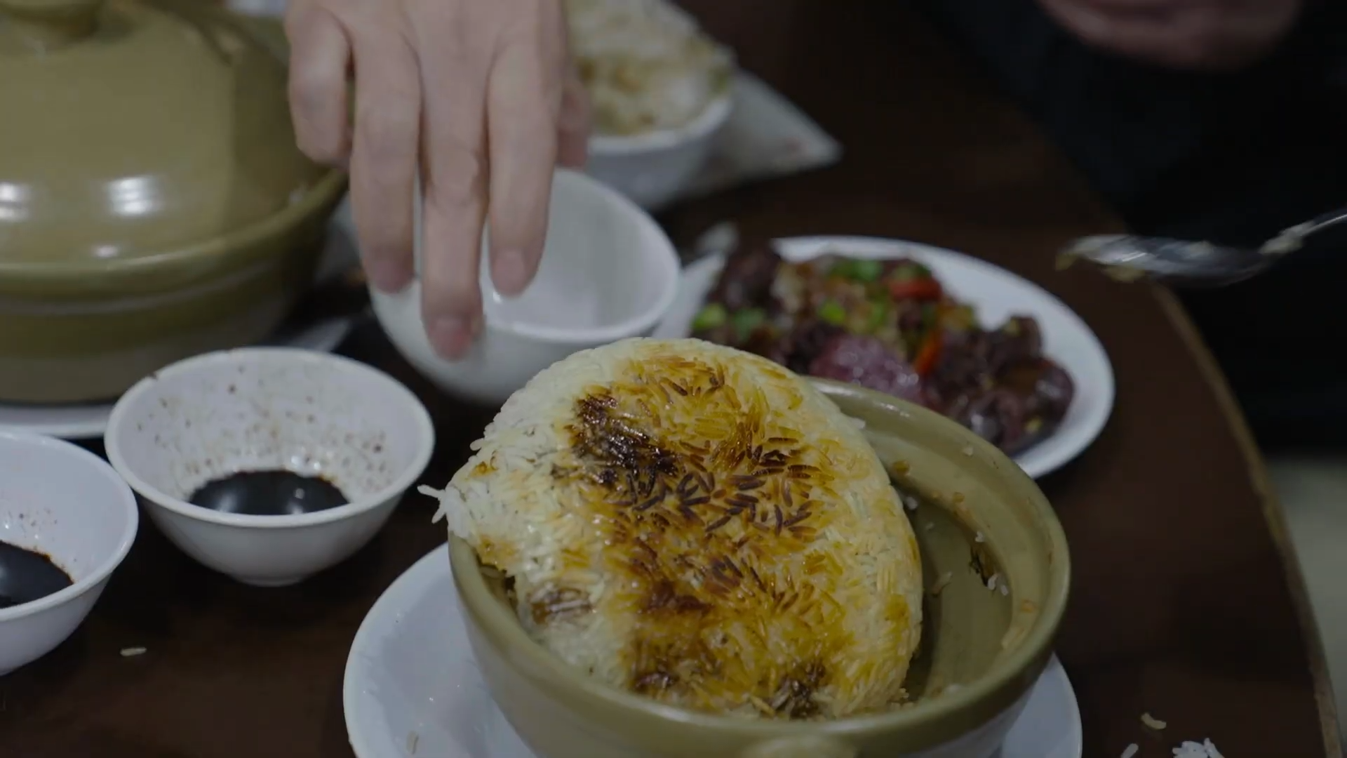 他認為煲仔飯好味要訣,是要有黃金窩巴,「這要靠黃金三十秒。」把醬汁順時針沿煲邊淋入煲中,再蓋30秒,沿邊弄鬆飯,再盛走表面的飯,再反底便可。![]()