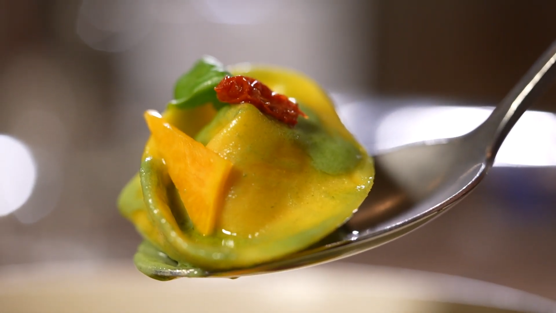 香烤南瓜餡意大利雲吞,雲吞皮主要的材料為水、麵粉及蛋黃,Anthony指用了幾年時間去調配適當的比例。「起初以為跟食譜便可,但發現效果不太理想,於是不斷改良,要做得好食,就要跟着天氣去調整!意大利雲吞要皮薄,所以要煙韌點,可以包實餡,同時不易煮爛。但如果用同一個韌度做闊條麵的話,因為大塊又厚,就會似橡筋,做的時候要想食客食的過程會怎樣?」