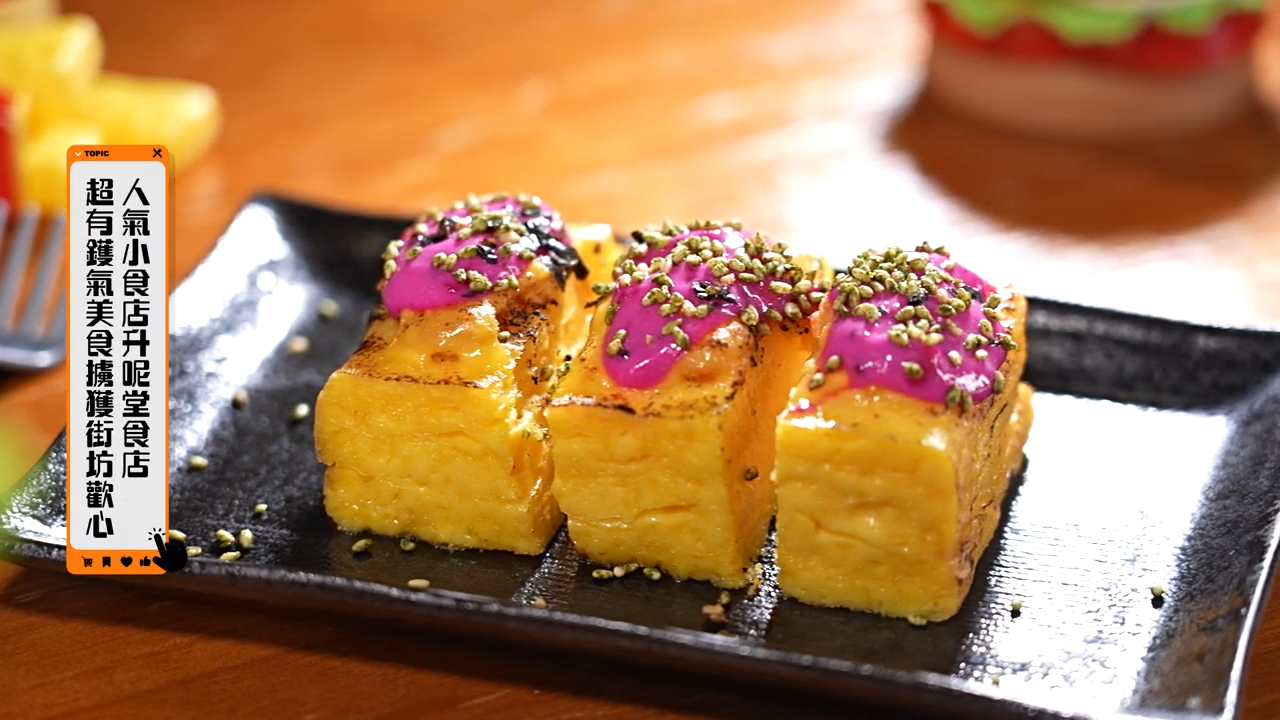 今集還有黃嘉雯(Carmaney)帶大家探店一間由外賣店升呢到堂食得人氣小食店。店內的招牌不得不提鹹蛋黃炸燒賣。它的鹹淡調和得剛剛好,外脆內軟,魚肉綿密,Carmaney指似棉花糖的口感。而炸燒賣不單止有鹹蛋黃口味,還有多達14款醬汁供挑選。而第二款特厚玉子燒配甜酸火龍果醬,賣相就極具吸引力,特別搶眼。玉子軟綿綿,外表裹著一層薄薄的焦糖,再加以火龍果甜酸醬點綴,又好看又好吃!還有份量十足的XO醬羊肉炒腸粉,醬汁均匀分佈在每一塊腸粉之中,鍋氣十足!![]()