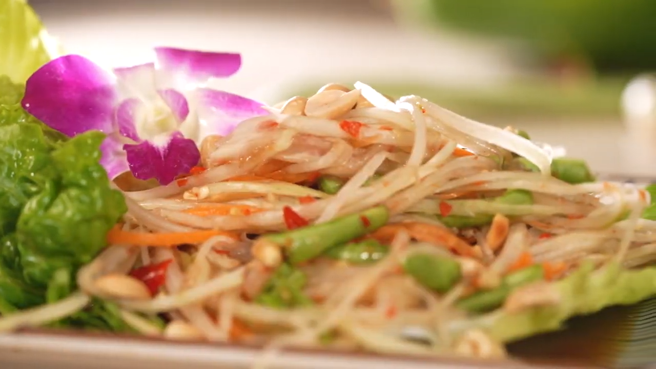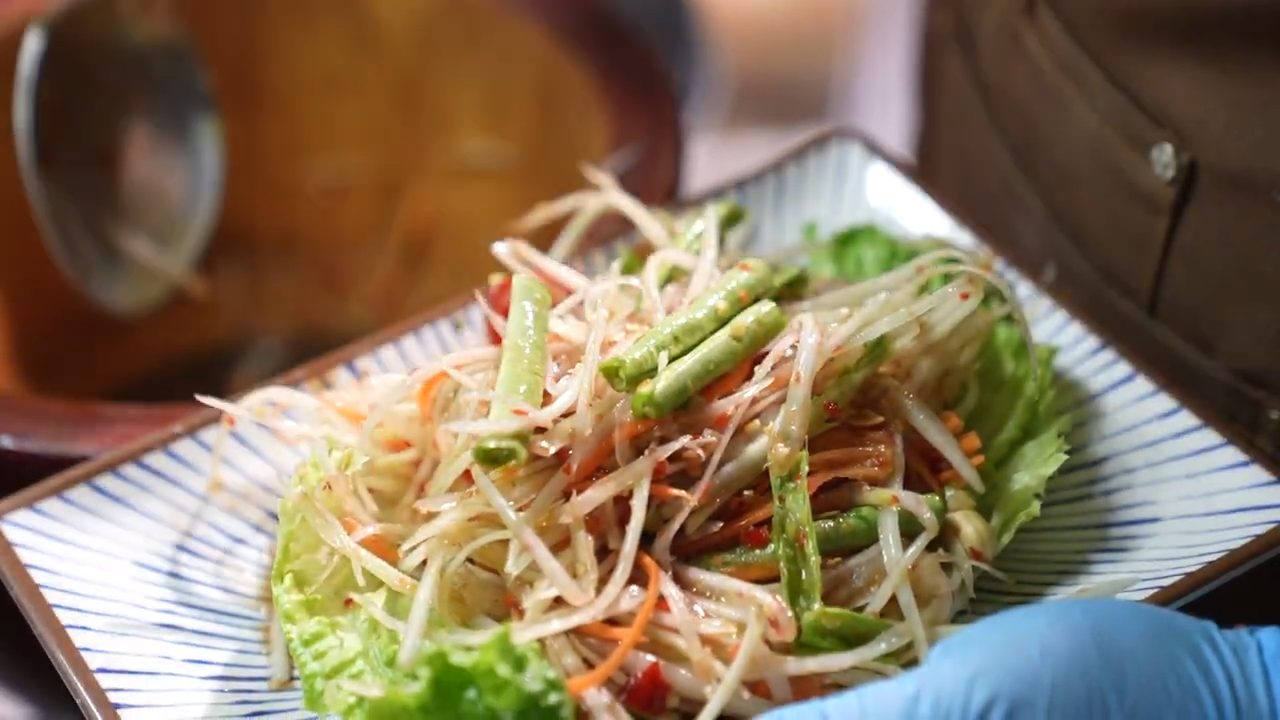 很多泰國客人僅僅因為一道泰式木瓜沙律慕名而來。Roy分享製作這道菜的秘密,除了添加豆角、番茄、花生碎、泰國臭魚醬之外,「靈魂醬料」就是由泰國師傅親自調製的秘製醬料。![]()