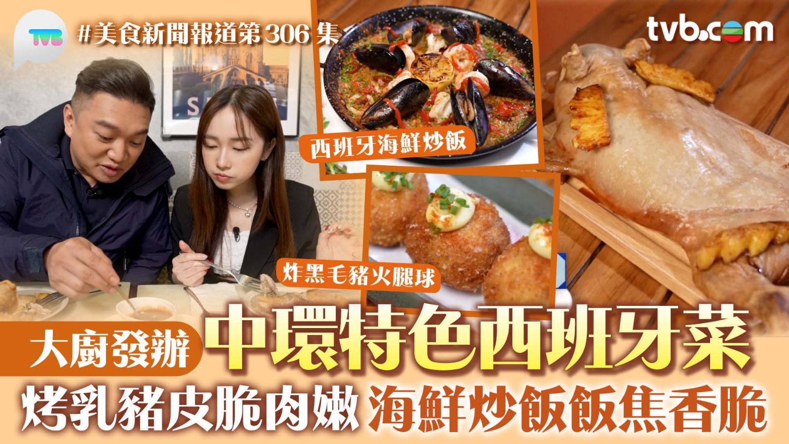《美食新聞報道》今集由名廚葉世昌帶林映暉(暉哥)到中環食西班牙菜!傳統名菜「西班牙烤乳豬」肉質嫩滑軟爛,上枱前主廚用瓷盤邊緣劈開乳豬後,將盤子摔碎,象徵迎接好運,充滿儀式感。 葉師傅揭秘烤乳豬選用3至4公斤且喝母乳的小豬,焗4個小時,並於烤盤下方加水,提升內部濕度,讓乳豬達至皮脆肉嫩的最佳口感。招牌西班牙海鮮炒飯,惹味飯焦,加上檸檬汁增添多重滋味,還有爽口彈牙的鐵板蒜蓉辣椒炒大蝦,以及炸黑毛豬火腿球,送酒一流!