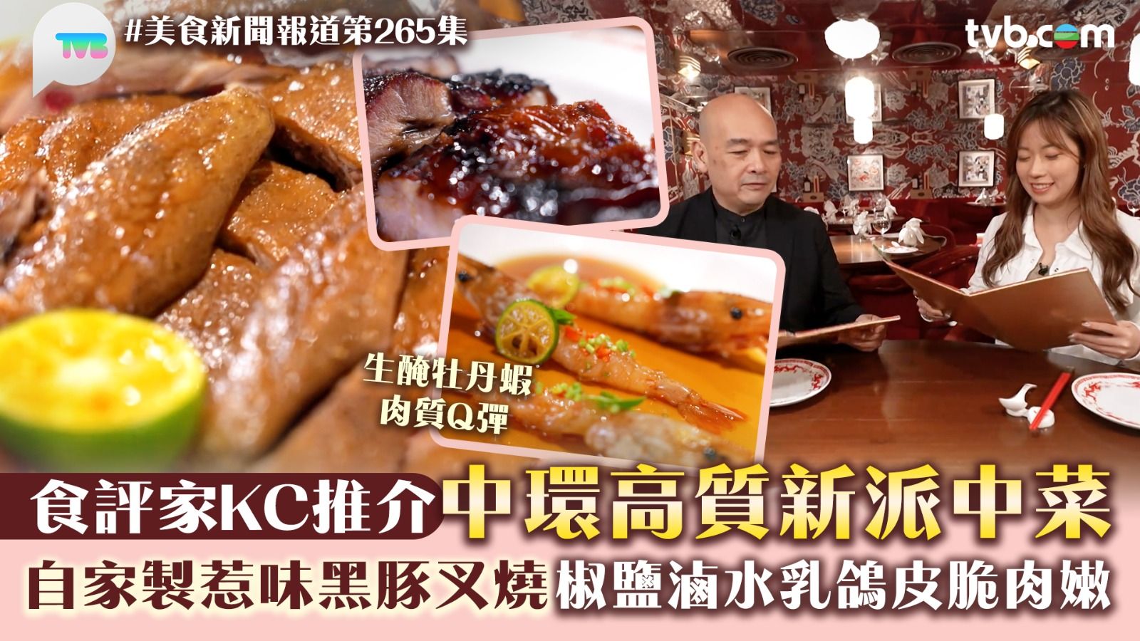 《美食新聞報道》今集由食評家KC帶波波黃婧靈去中環食新派中菜!潮式生浸牡丹蝦,選用日本牡丹蝦,肉質極度甜美、細嫩,蝦膏濃郁。蜜汁黑豚肉叉燒,KC透露製作叉燒大多選用脢頭肉,肥瘦肉分布均勻,有咬口又不柴。必食還有椒鹽脆皮滷水乳鴿,選用28至30日大的頂鴿,比一般乳鴿肉量更多,製作工序繁複,先滷後鹽燒,鎖住豐盈肉汁。