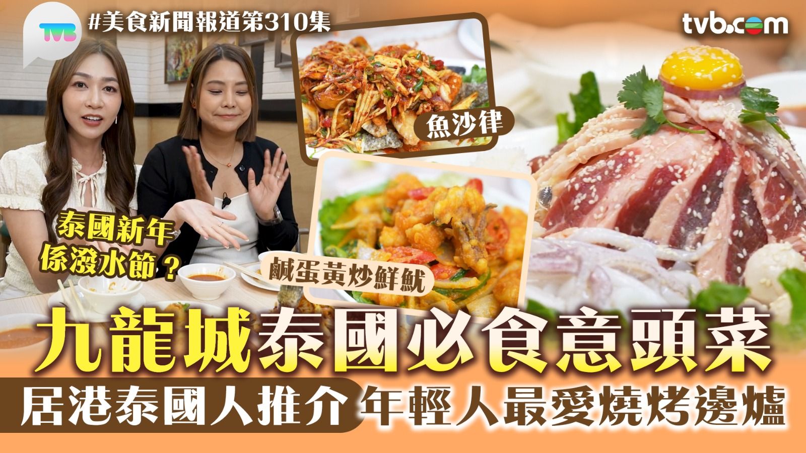《美食新聞報道》今集由居港泰國人Aimee帶黃嘉雯(Carmaney)品嚐泰國意頭菜!Aimee介紹,每年4月13日至15日是泰國新年,俗稱潑水節,為迎接新一年,泰國亦有必食的新年菜式!現時最受泰國年輕人歡迎的燒烤邊爐,食材豐富,象徵笑口常開嘅鮮蝦、牛肉、牛百葉、魷魚鬚等,還可以一次滿足兩個願望;酸酸辣辣的魚沙律,盲鰽魚配搭青芒果,超級開胃;還有鹹蛋黃炒鮮魷,鮮魷肉質鮮嫩,每一啖都有鹹蛋黃醬,惹味十足!