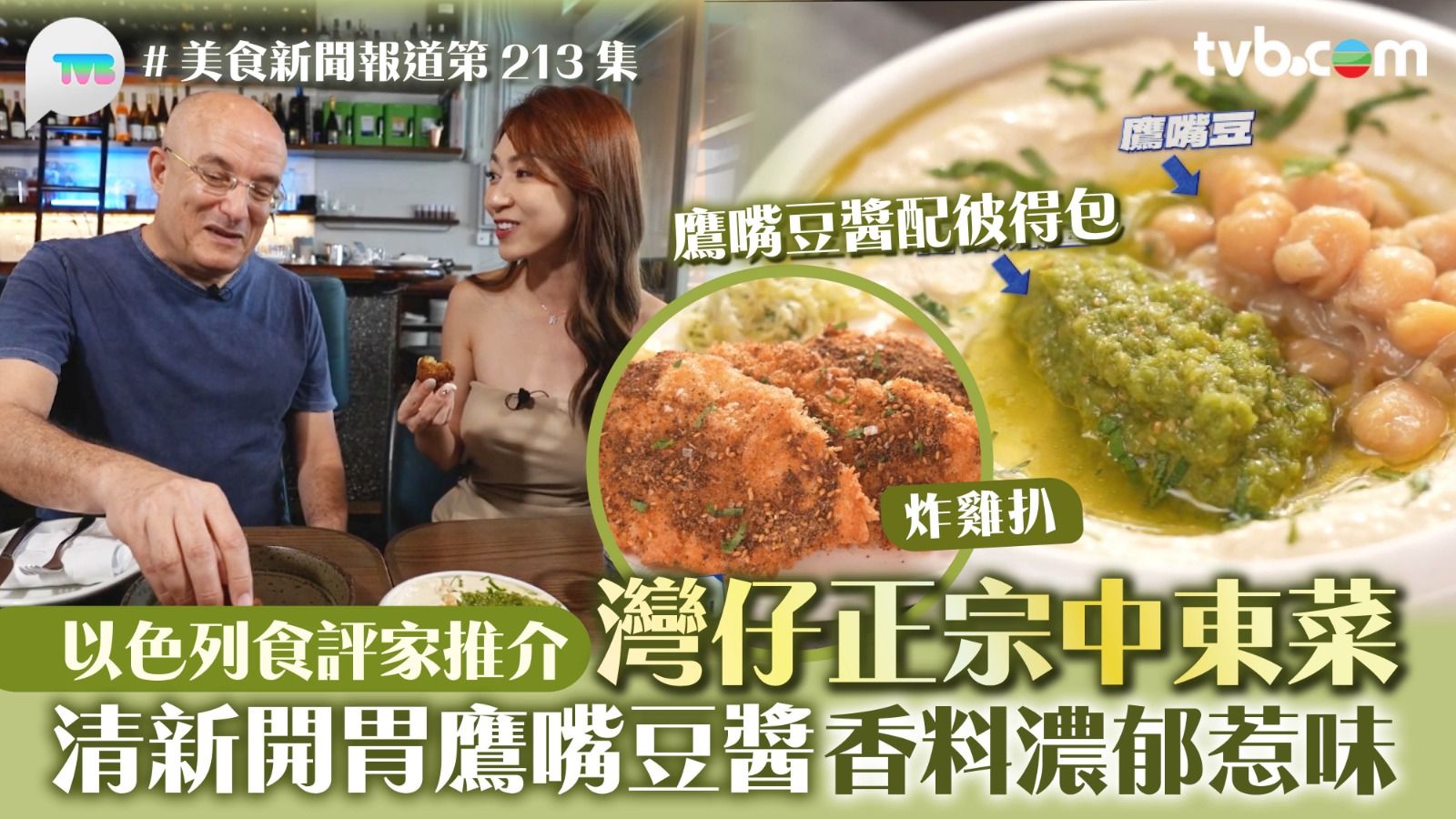 《美食新聞報道》今集有以色列食評家Gil Hovav帶路,與黃嘉雯去灣仔試正宗中東菜!必試香滑鷹嘴豆醬配彼得包,層次豐富,自家製香菜辣醬用7種材料,清新又開胃。炸鷹嘴豆餅外脆內軟,佐以酸甜安巴醬超惹味。炸雞扒炸粉適中,脆口唔油膩。Gil還親自示範中東人用手就餐的傳統,原來蘸醬都有講究,不同地區的人都有特別的習慣!