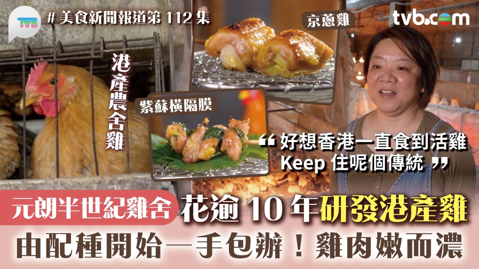 今集《美食新聞報道》的《故事味緣》主角是元朗農場主理人Yvette,農舍內的雞從配種、孵雞蛋、養殖雞再到出貨全部一手包辦,Yvette指花費逾10年研發農舍雞,希望港人能吃得更加健康安心。整個雞場佔地逾10萬呎,總共有8萬隻雞。Yvette先帶林映暉(暉哥)參觀雞婆屋、孵蛋機,農場的雞使用人工受精的方式培育,孵蛋機內的溫度、濕度由電腦控制,等17日後再轉移至出雛機。剛出生的小雞進入小雞雞舍,由於小雞的抵抗力、消化能力都處在最弱的時間,除了溫度需控制在約40攝氏度之外,還會選用特殊的飼料餵養小雞,30日再轉移至別處。小雞飼料包含粟米粒、黃豆粉、麵碎以及維他命等,營養均衡。不同的季候,飼料也會相應不同。