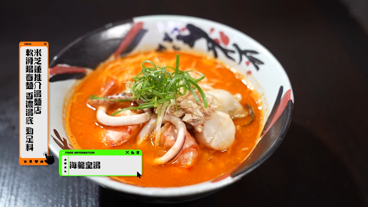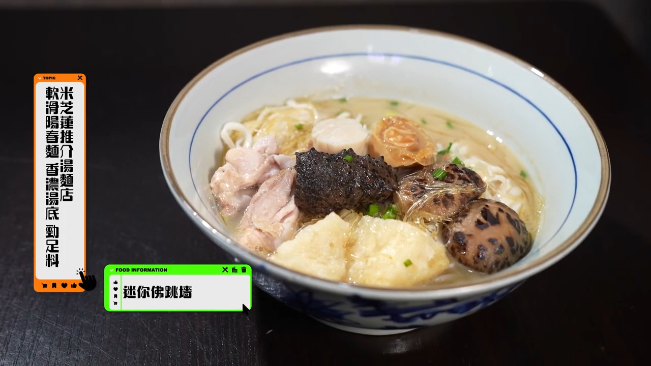 而今集還有暉哥林映暉帶路揾食,尋找隱藏在大圍深巷中的寶藏麵店。第一款,迷你佛跳墻陽春麵,高湯熬足16個小時,海參爽口,鮑魚滑嫩。第二款,海龍皇湯,配有海蝦尾、北海道魷魚、藍蟹肉,勁足料!老闆透露湯底選用佛跳墻的高湯再加上蝦頭,才會如此濃鬱。![]()