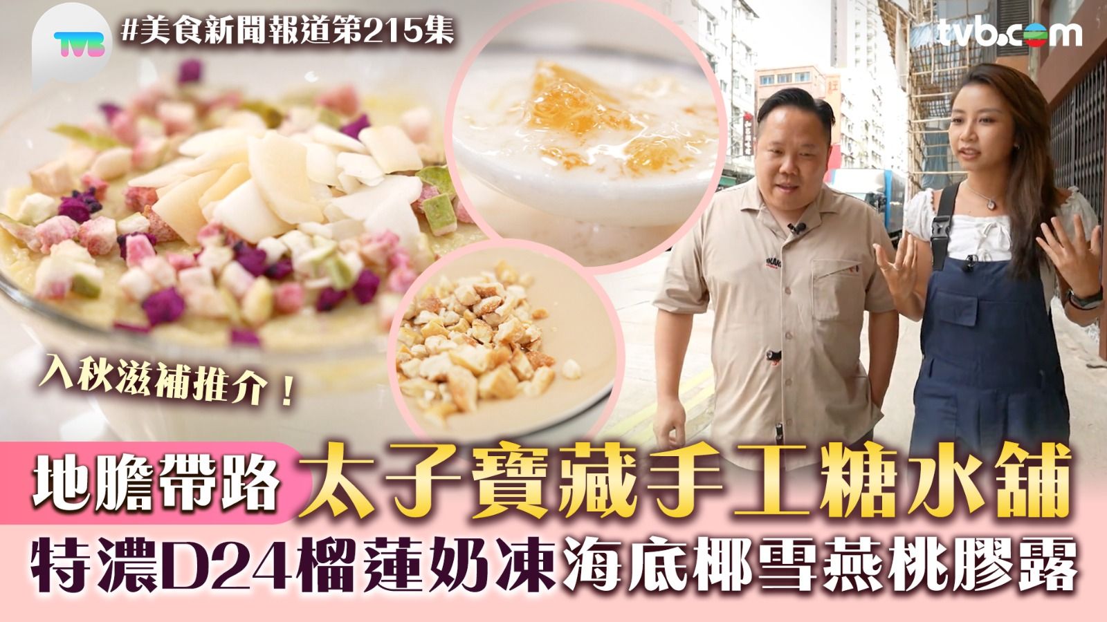 《美食新聞報道》由太子地膽蕭欣浩博士帶路,與何泳芍(Honey)一起尋找太子隱藏味道!今集二人去到一間寶藏手工糖水舖,品嚐繽紛雙層D24榴蓮奶凍,濃郁榴蓮香氣撲面而來,一啖包含椰子片、榴蓮肉、果乾三種滋味,新鮮榴蓮果肉呈奶油狀,甜而不膩,榴蓮控必試!海底椰椰汁雪燕桃膠露;用料足,海底椰脆,桃膠爽口,養顏之選;滋陰補腎腰果露,入口順滑,粒粒腰果口感豐富,老闆揭秘製作時需邊煮邊不停攪拌,好味到蕭博士「光速」清空!