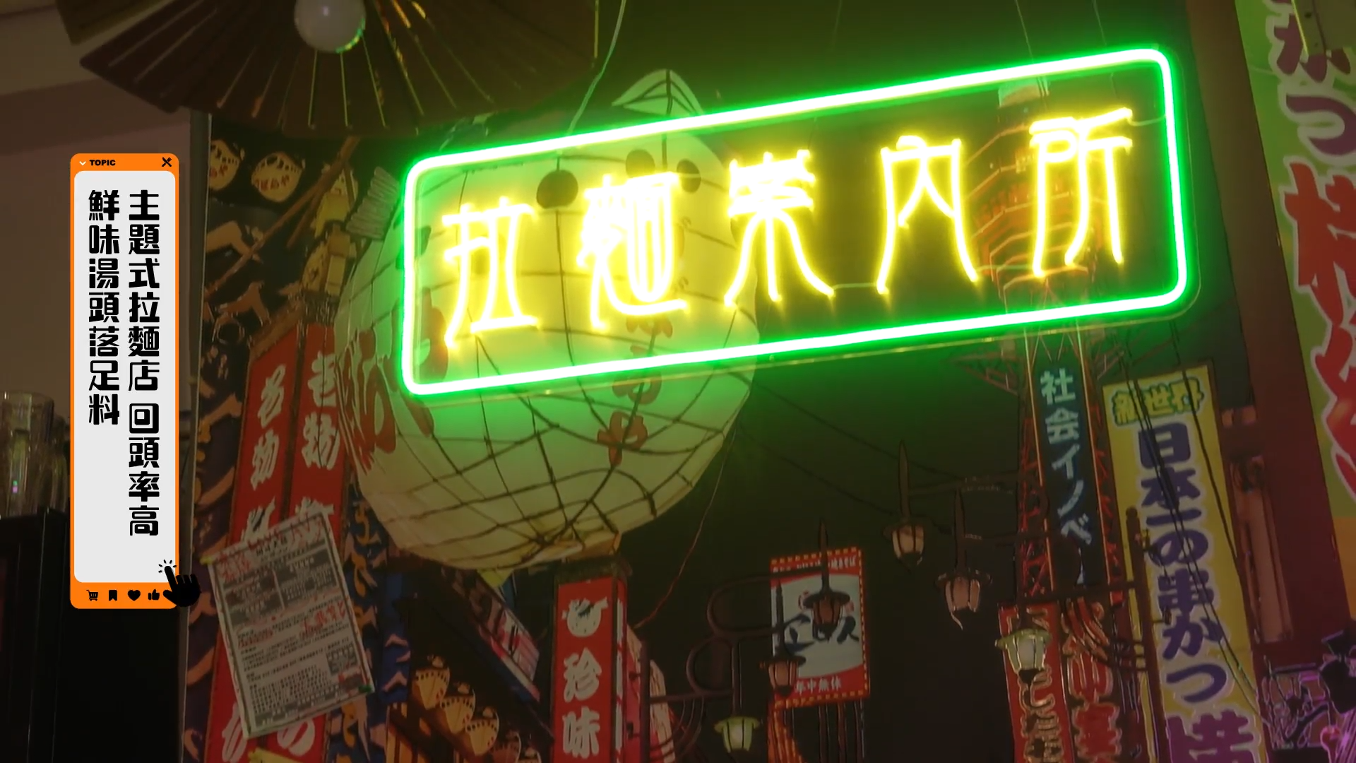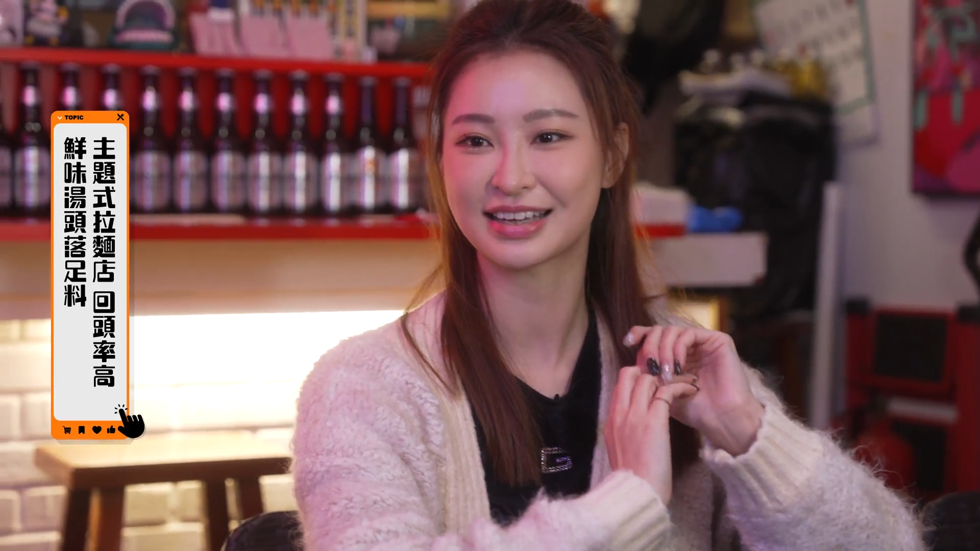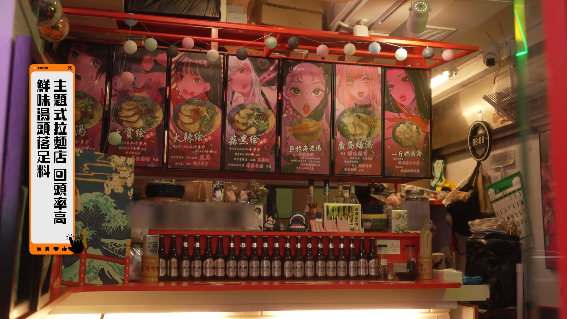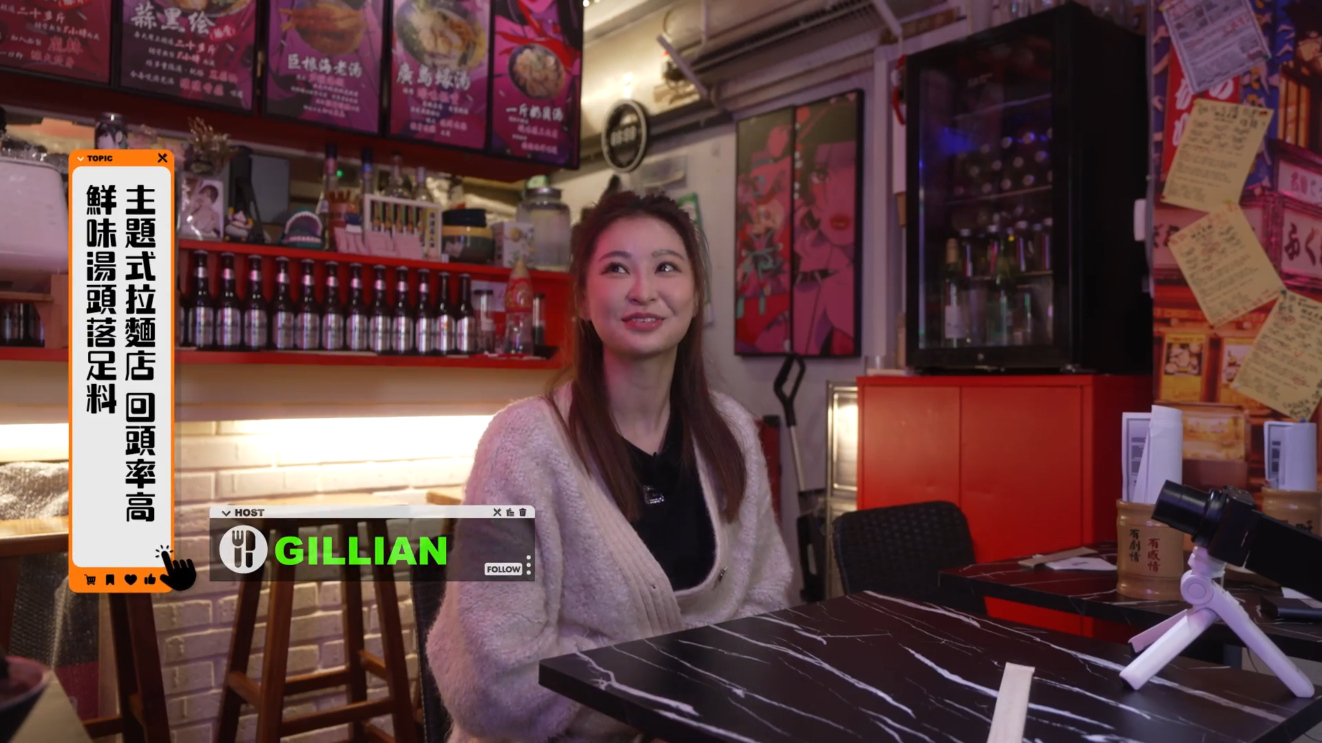 今集還有伍倩彤(Gillian)帶大家到尖沙咀一間主題式拉麵店,以日本愛情動作片做主題,裝修別具一格,充滿氣氛。店中有一幅由新加坡漫畫家繪製的菜單,再配合老闆精心設計的拉麵名,成件事都令人想入非非。![]()