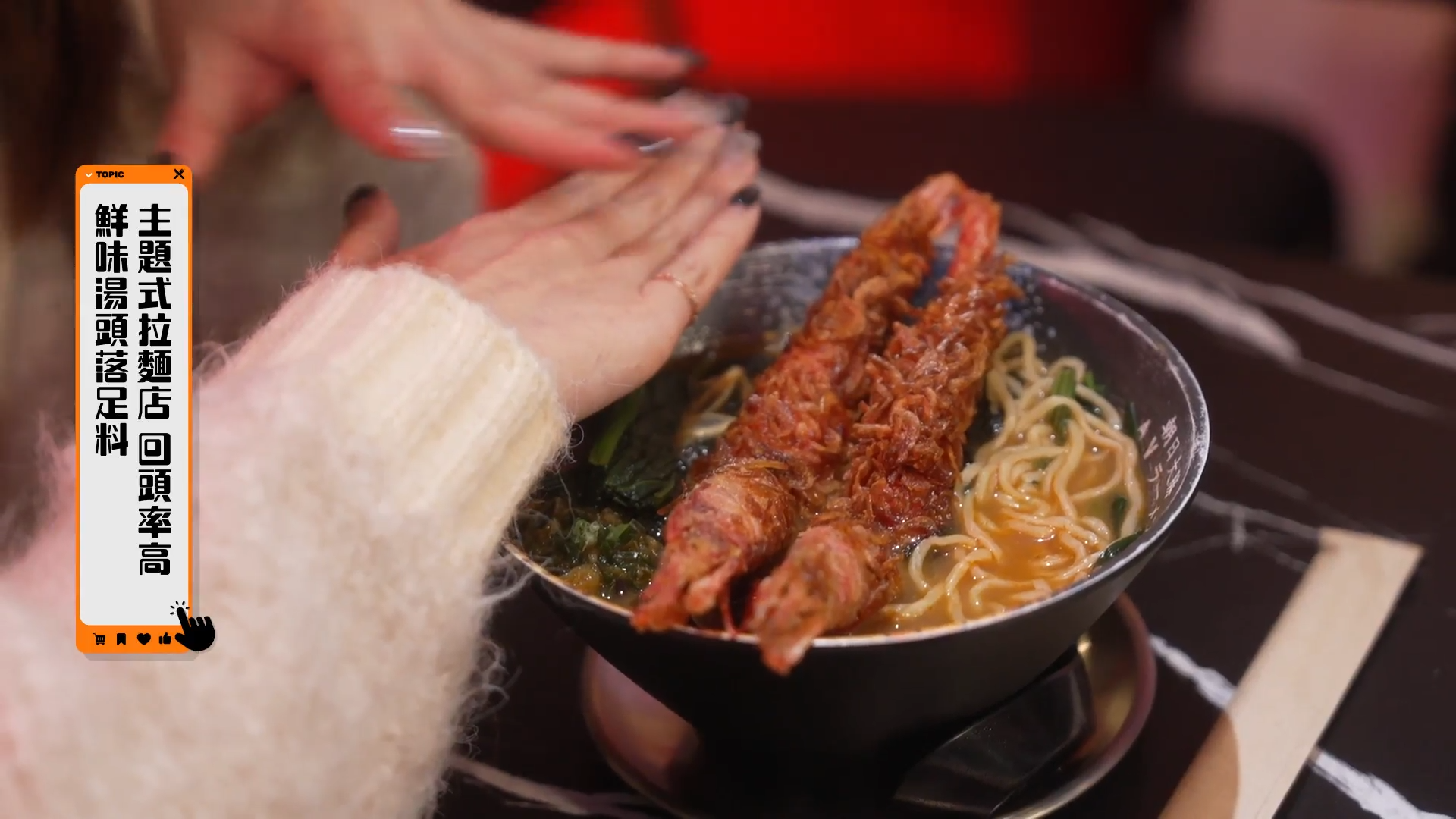 這裡的拉麵非常有特色,Gillian試食了當中兩款。首先是SSIS 巨根海老拉麵,湯底用了60斤花竹蝦煮成,十分濃味。拉麵配有跟手一樣大的赤蝦,並用櫻花蝦包着一起炸,代替本身天婦羅炸漿。Gillian表示:「無咁膩同飽,口感好脆,赤蝦肉質都好結實,好新鮮。」她更指赤蝦就算浸了湯還是很脆,兩種蝦加在一起,蝦味特別濃。![]()