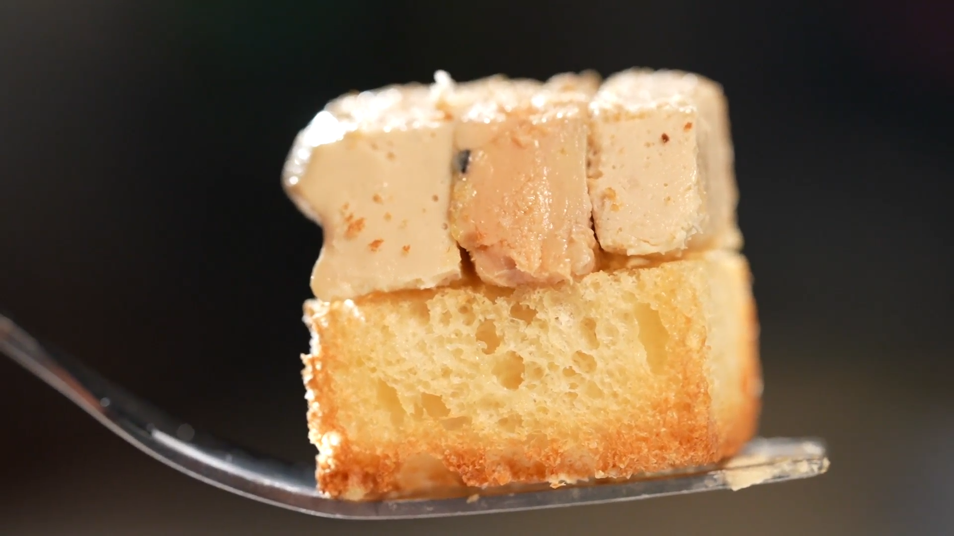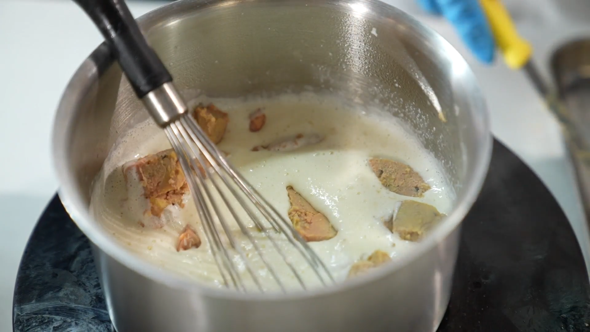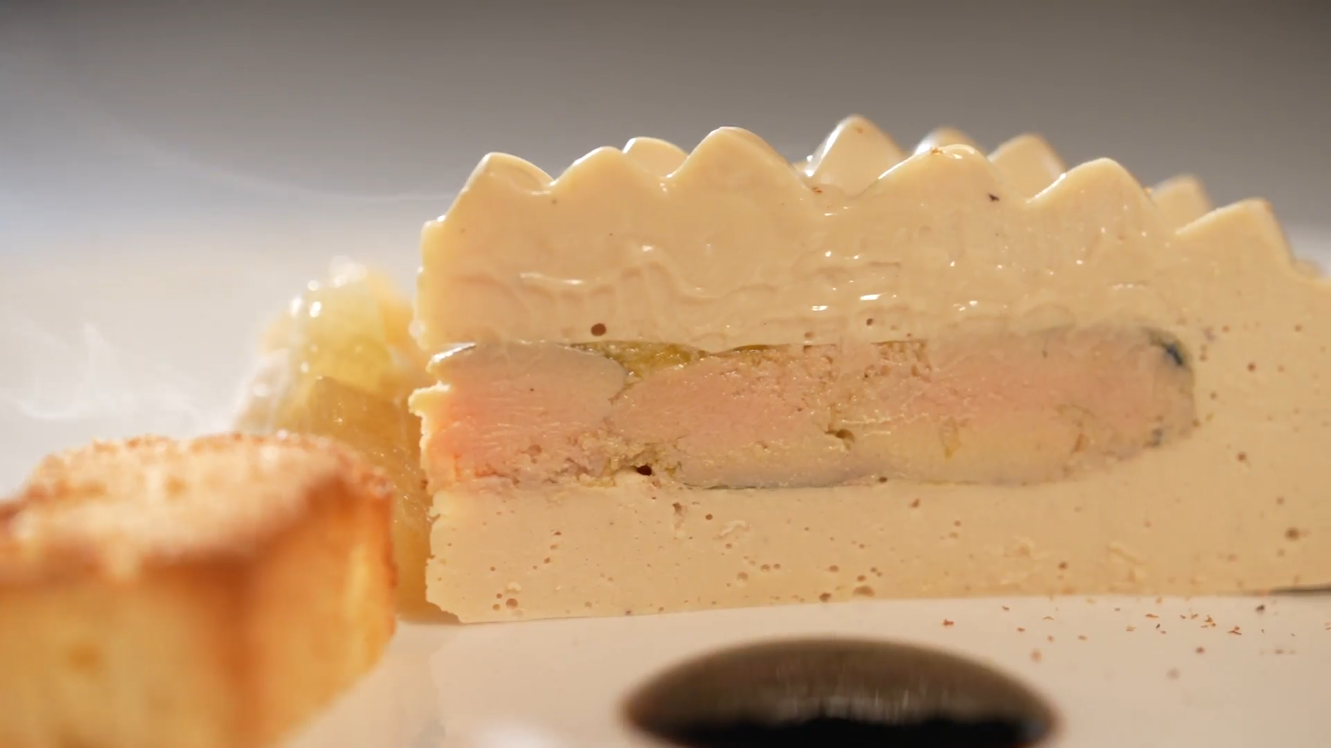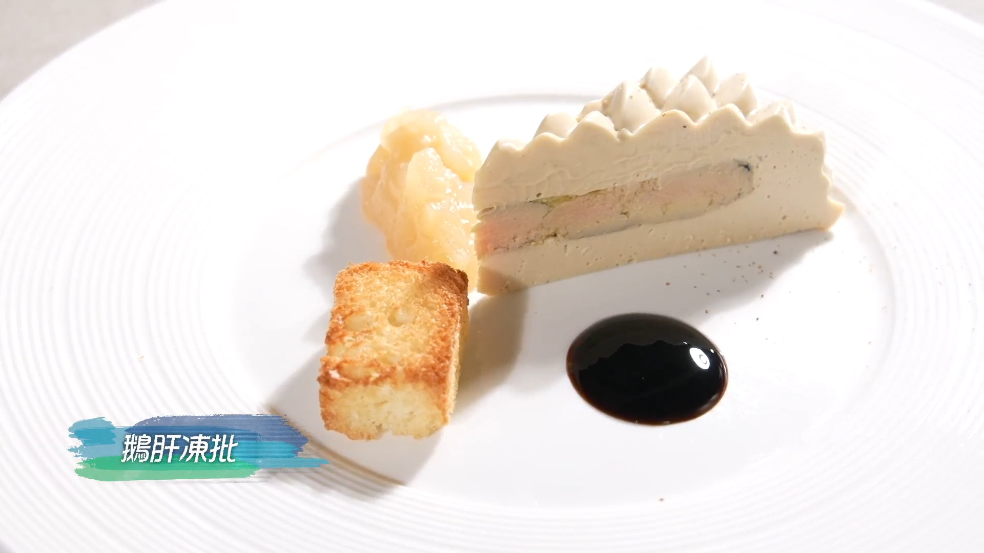 鵝肝是法國菜常見食材,為突出餐廳的特色,Kenji設計了鵝肝凍批。他先製作鵝肝慕絲,當滾好牛奶和忌廉後,加入鵝肝。完成後,他更會拍打鍋底,把當中的空氣拍走。之後他把一早定型的鵝肝和慕絲放到模中冷凍。![]()