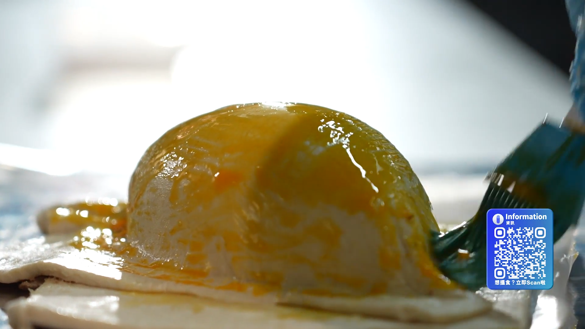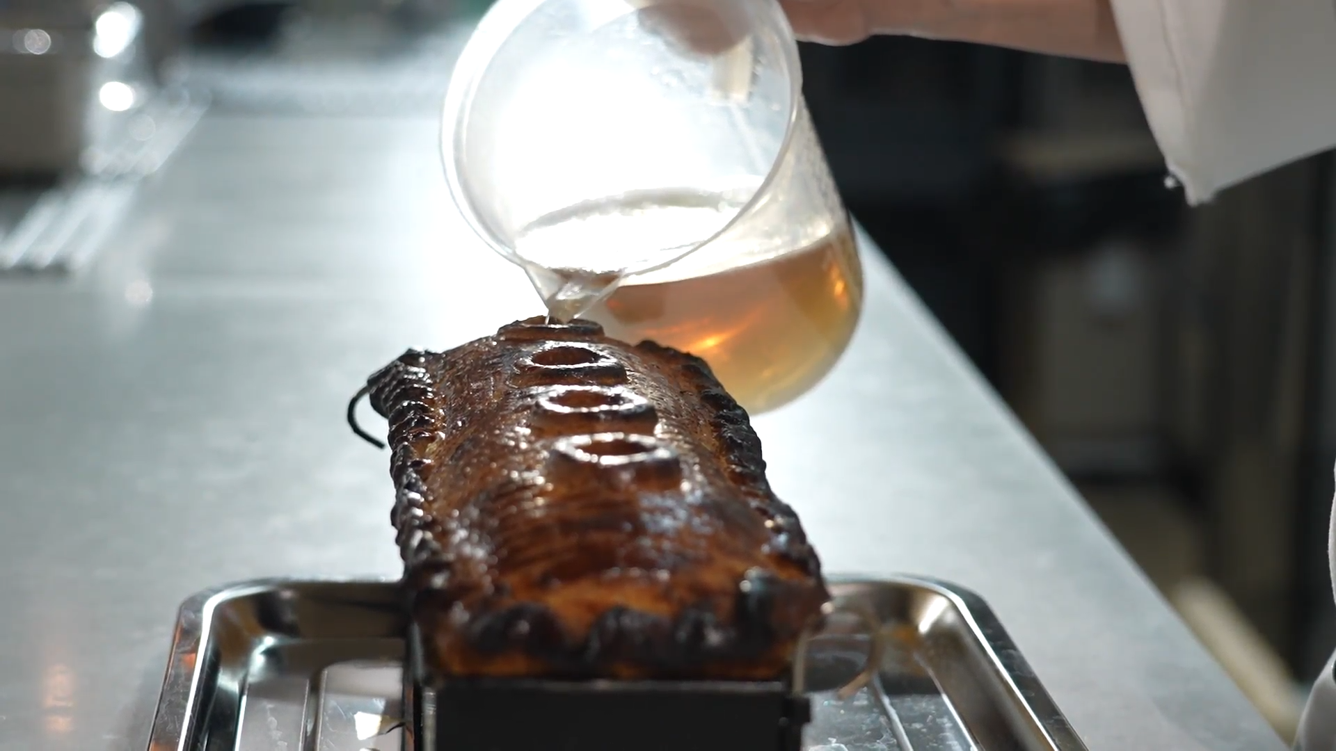 把肉批焗成後,再倒以雞骨、雜菜製成的雞水啫喱。Kenji指這可以用來填滿肉批空間,因為當中包了肉,而肉是會收縮,所以要用雞水啫喱填滿空位。他指整個過程需要在兩個鐘內慢慢倒。![]()