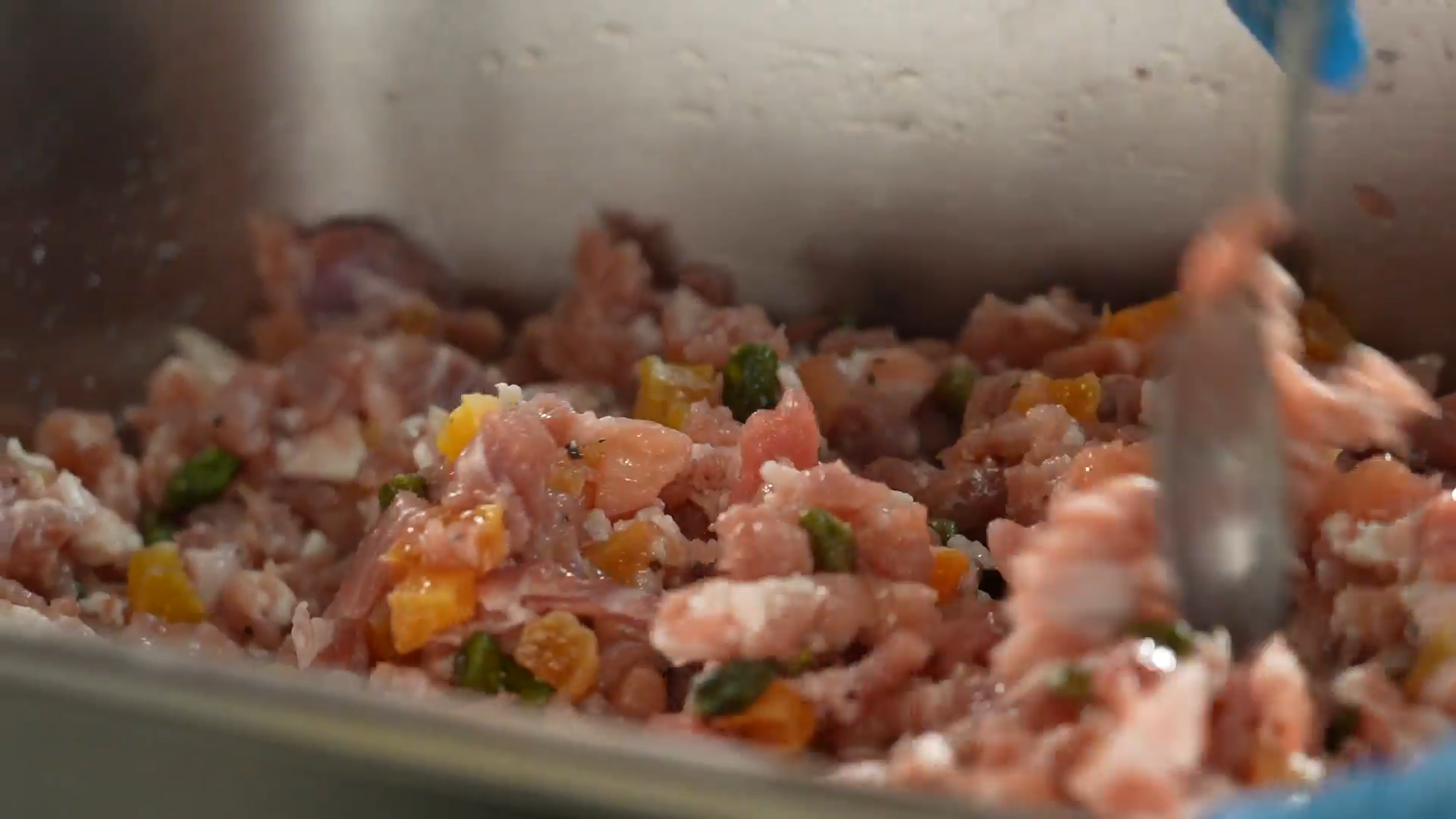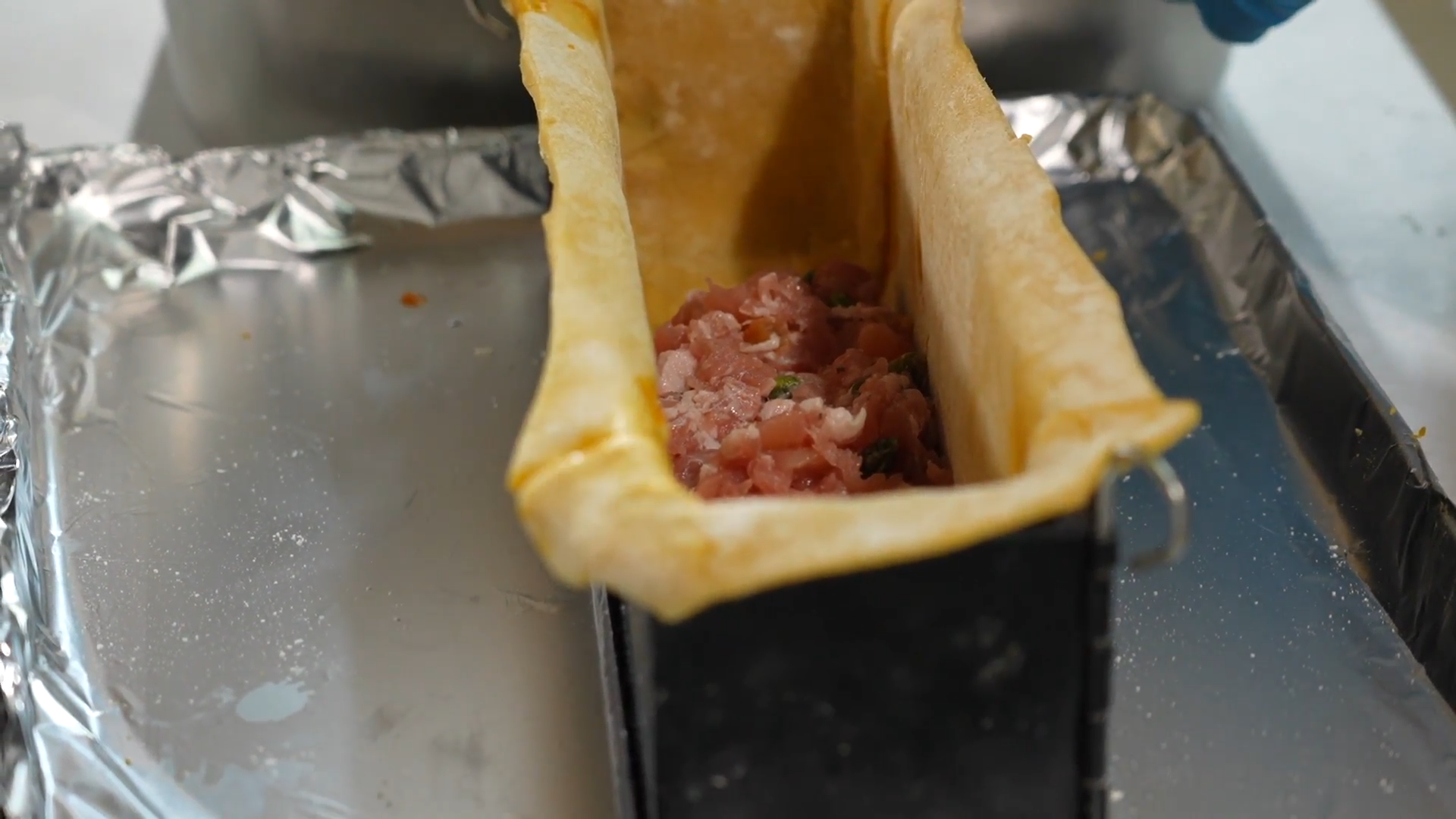 Kenji會先用黑椒、五香粉、白酒和白蘭地把餡料醃一晚,讓肉類吸收所有調味,再放上煎過的鵝肝,鋪上肉餡,讓整體口感和味道豐富。![]()