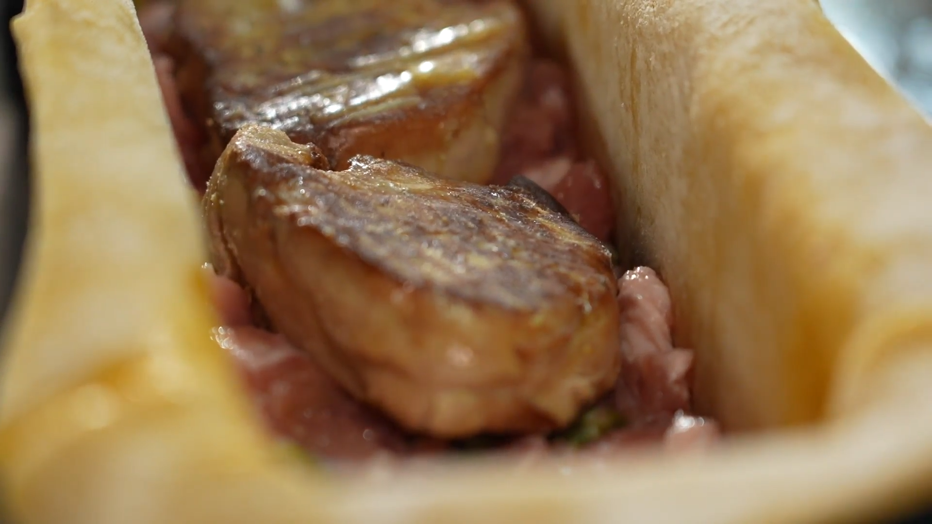 到他把肉批引進餐廳時,亦堅守這個原則。提早一日預備批皮,再放入雪櫃讓其發酵,肉批採用牛油皮,咬落脆口。據了解,在法國,每個地方的肉批餡料都不同,可以用豬肉、雞肉、海鮮,甚至是淨菜。而Kenji就選擇了五花腩、豬梅頭以及雞胸肉,而為減低肉的油膩感,他還加入了黃梅乾和開心果。他解釋:「乾果食落去會多啲甜味,唔會得肉咁單調,豬肉會帶有脂肪,會無咁乾。」