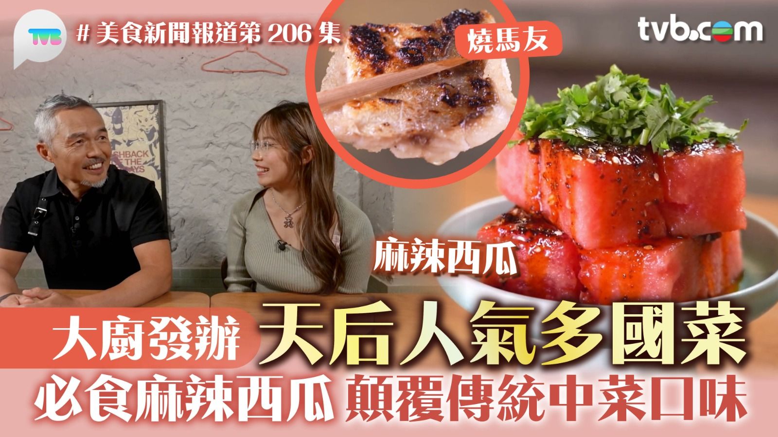 《美食新聞報道》今集「大廚發辦」由大廚莫燦霖(莫San)帶波波去天后特色小酒館,品嚐創意外國菜。莫師傅分享自己收工後,經常來此處飲啤酒放鬆,更讚每道菜都水準十足!「麻辣西瓜」以新鮮西瓜配麻辣香料與芫荽,層次豐富,用生果作頭盤顛覆傳統中菜口味,十分有驚喜。「雞皮仙貝」香脆薄身,製作需先去除皮下脂肪,再以慢火烘烤逼出油分,工序繁複。莫師傅重點推介「燒馬友」,魚皮香脆、肉質嫩滑,做法講究——先醃漬風乾2至3晚,令外皮乾身,燒出脆口效果。「新鮮白鱔配陳皮豆豉汁」經熟成風乾再燒製,肉質鬆化,酸甜醬汁更開胃。最後「西班牙黑毛豬叉燒」肉嫩多汁,配搭炸蛋、炸米通及舊式燒味店先有嘅蠔油豆,豆粒吸盡醬汁後更顯香甜。如此有創意配搭,更令莫San想起黯然消魂饭?