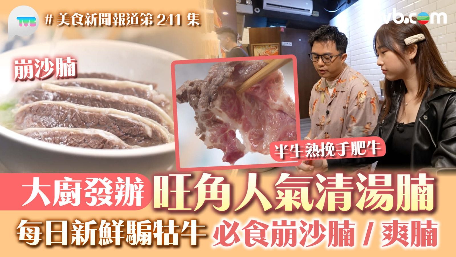 《美食新聞報道》今集「大廚發辦」米芝蓮年輕廚師Frankie帶林映暉(暉哥)品嚐旺角人氣清湯腩,每日以新鮮騸牯牛製作,湯底用牛骨慢熬,色澤清澈味道清甜。