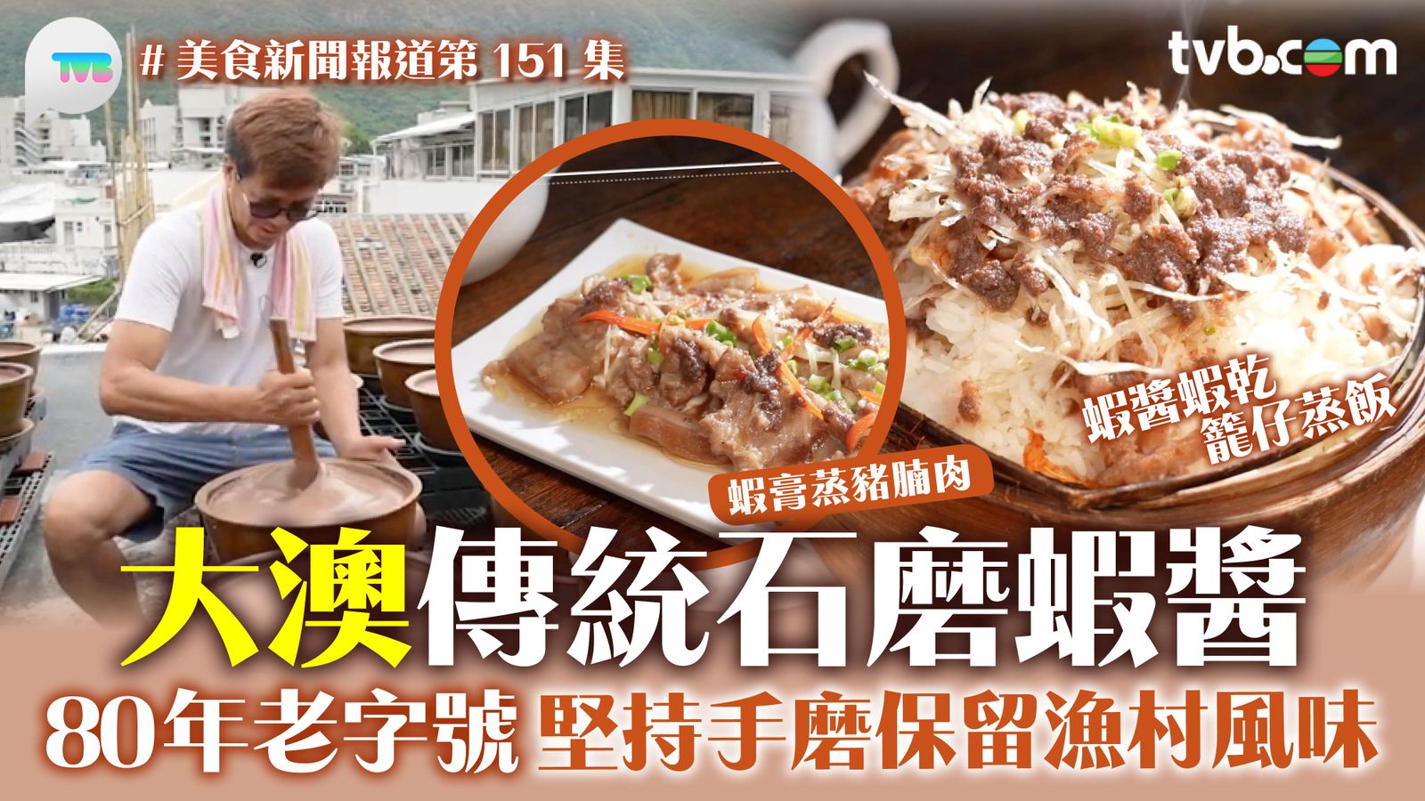 「蝦豬餅」為店主原創小食,炒香蝦醬及豬肉,以薄餅包起。蝦醬鹹香,搭配豬肉與薄餅,樸素的美味!五十幾年蝦醬經驗的志哥,為大家展示蝦醬的製作過程。「銀蝦仔」肉多味鮮,適合發酵蝦醬。以木棍不斷攪勻椿碎,有助於鹽份滲透。一百斤蝦仔才能得到一缸半成品!再加以手工石磨,雖速度較慢,但能夠保留蝦大量的油份及香氣。絲滑的蝦醬經過磨製後好需要進行晾曬。蝦醬曬乾期間還需要不斷人手攪動,令水份及腥味得以均勻揮發。蝦醬曬足3個月後,就可以入樽啦。