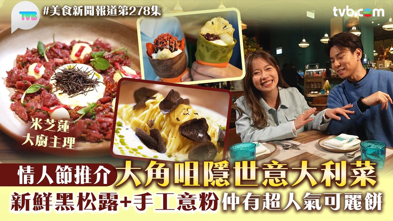情人節將至,蔡景行(行仔)孖黃婧靈(波波)推介情人節CP值超高浪漫餐廳!這間位於大角咀的隱世西餐廳,主打手工意大利菜。「生牛肉他他」,以法松娜牛柳粒配搭新鮮黑松露及鹹香芝士醬,多重滋味衝擊味蕾!招牌海鮮薄餅,歷時近兩天手工製作,食材配搭簡單,海量芝士瞬間俘虜波波的心!西冷牛肉薄切,包含芝士、火箭菜、車厘茄及意大利黑醋等,配料豐富啖啖驚喜。黑松露細扁麵彈牙掛汁,配自家芝士醬及意大利直送黑松露,邪惡度爆燈。兩人隨後試食大角咀人氣可麗餅,薄薄可麗餅皮不失煙韌口感,配新鮮水果及雪糕,冰火交融!