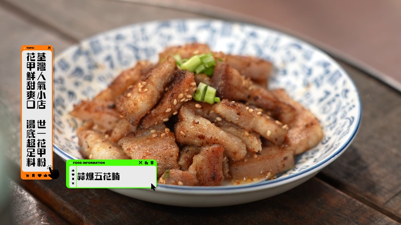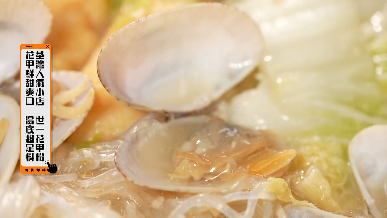今集還有伍倩彤(Gillian)帶路搵食!來到基灣人氣小店,品嚐世一花甲粉。湯底勁鮮甜,每一條粉絲都吸滿湯汁,花甲肉Q彈新鮮,配菜娃娃菜芽菜再加上炸蒜和普通蒜蓉,香氣四溢!冰鎮醉雞翼,爽脆中帶有淡淡的酒香。而蒜爆五花腩,煎到金黃色,十分誘人。最後配合足料冰凍腐竹糖水,超級解膩。![]()