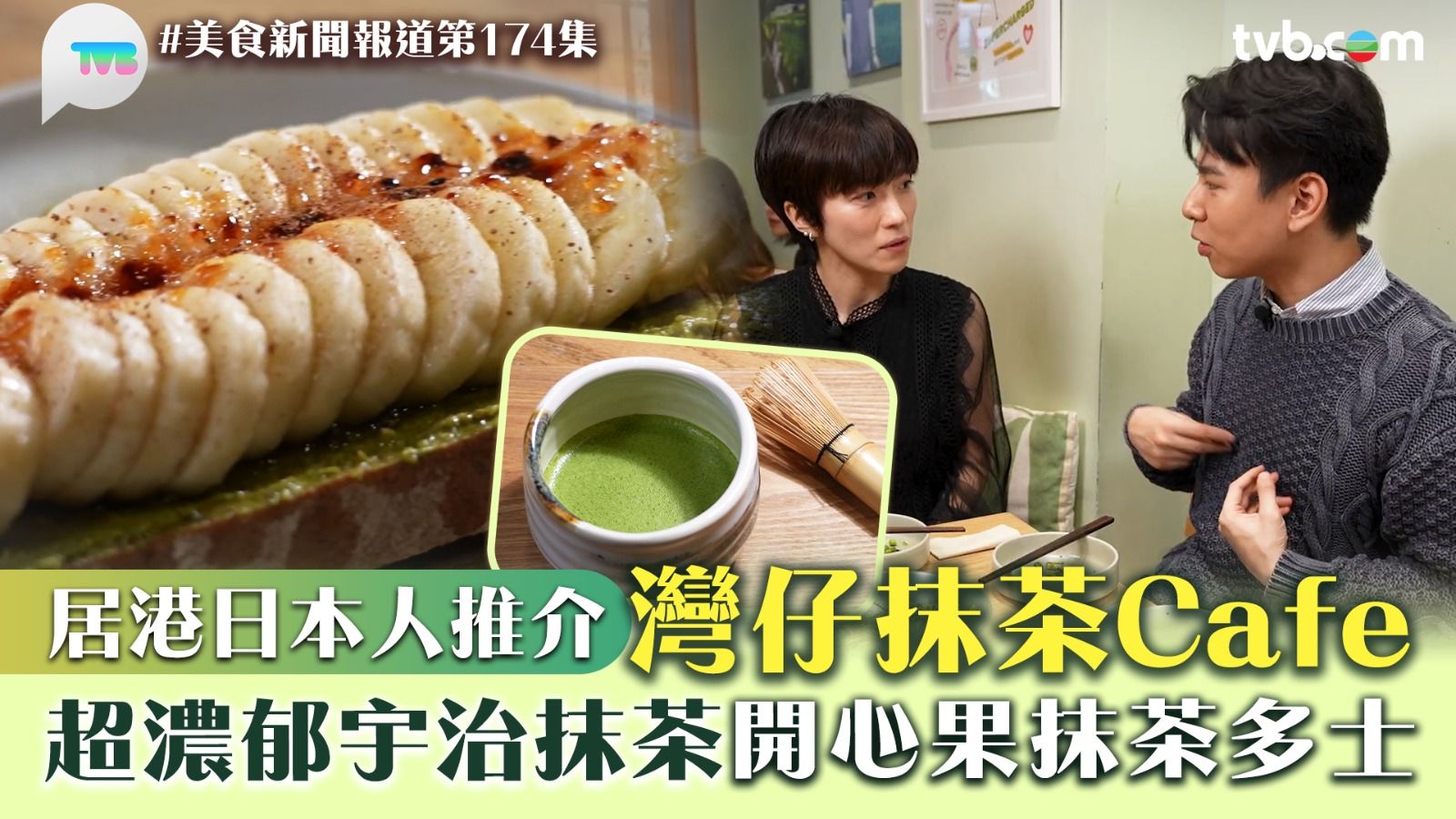 《美食新聞報道》今集由居港13年的日本人當重靜香帶蔡景行(行仔),到灣仔Cafe感受日本抹茶文化。抹茶是日本茶道的核心,有保護心臟、改善腸道、提神等益處。當重靜香介紹日本人視茶為「藥」,故於飲茶前先享用和菓子,以免空腹飲茶造成腸胃不適。香蕉椰子開心果抹茶醬吐司,濃郁的茶香與香甜的香蕉結合,加上開心果顆粒質感,甜度適中好美味。傳統手拂抹茶,將抹茶打出泡沫,能確保茶粉均勻溶解,從而減少苦澀,提升柔順口感。綠茶蕎麥麵沙律,配上醬油及柴油乾製成的醬汁,清爽又開胃。