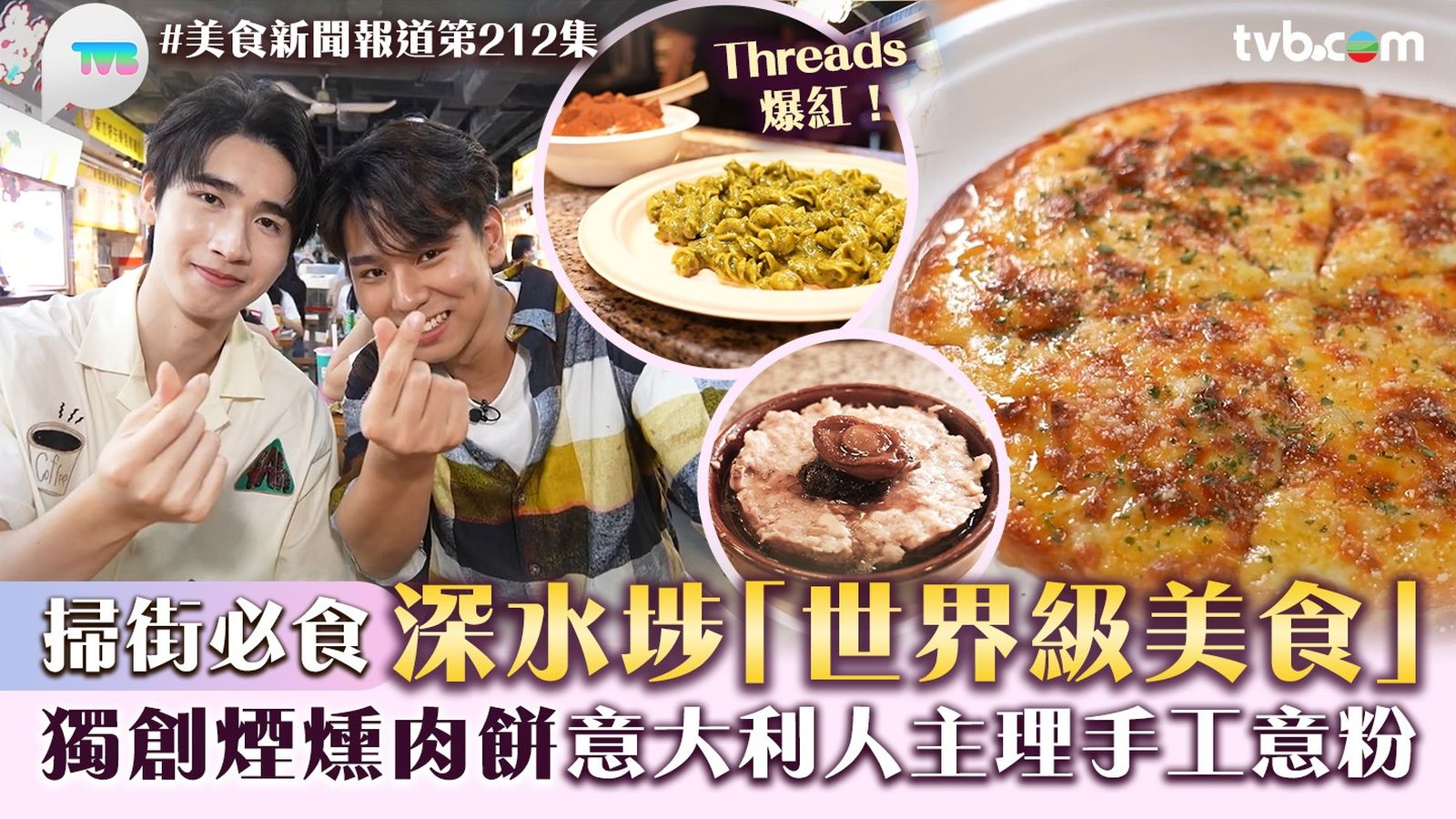《美食新聞報導》今集蔡景行(行仔)孖馮皓揚(羊羊)去深水埗掃街!第一站食韓式薄餅、炒年糕即食麵加重芝士,韓式薄餅由車打芝士、水牛芝士、巴馬臣芝士製成,「芝」味無窮!第二站有全港首創煙燻肉餅,加入鮑魚髮菜,口味新奇之餘鮮味十足。第三站,二人去到五星級酒店大廚經營的小店,芫荽香蒜大蝦意粉香辣入味,啖啖蝦肉配上醬汁融入其中,超級好味。最後,還有由意大利人主理的手工意粉,其中手工意大利螺絲粉配自家製青醬,每日限量65份,想食就要趁早啦!
